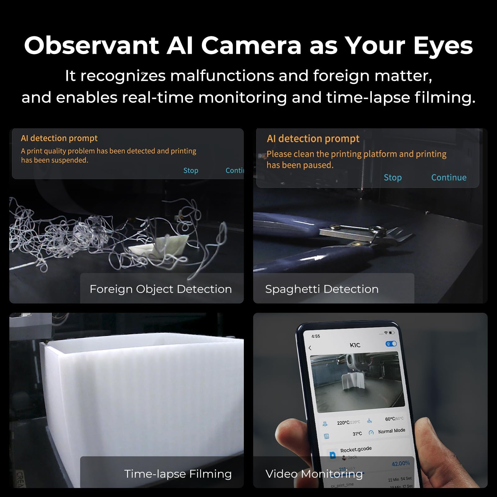 - 【K1C with AI Camera】K1C is equipped with an AI camera as standard. It can always monitor whether there are foreign objects or malfunctions during the printing process. and enables real-time monitoring, time-lapse photography functions.