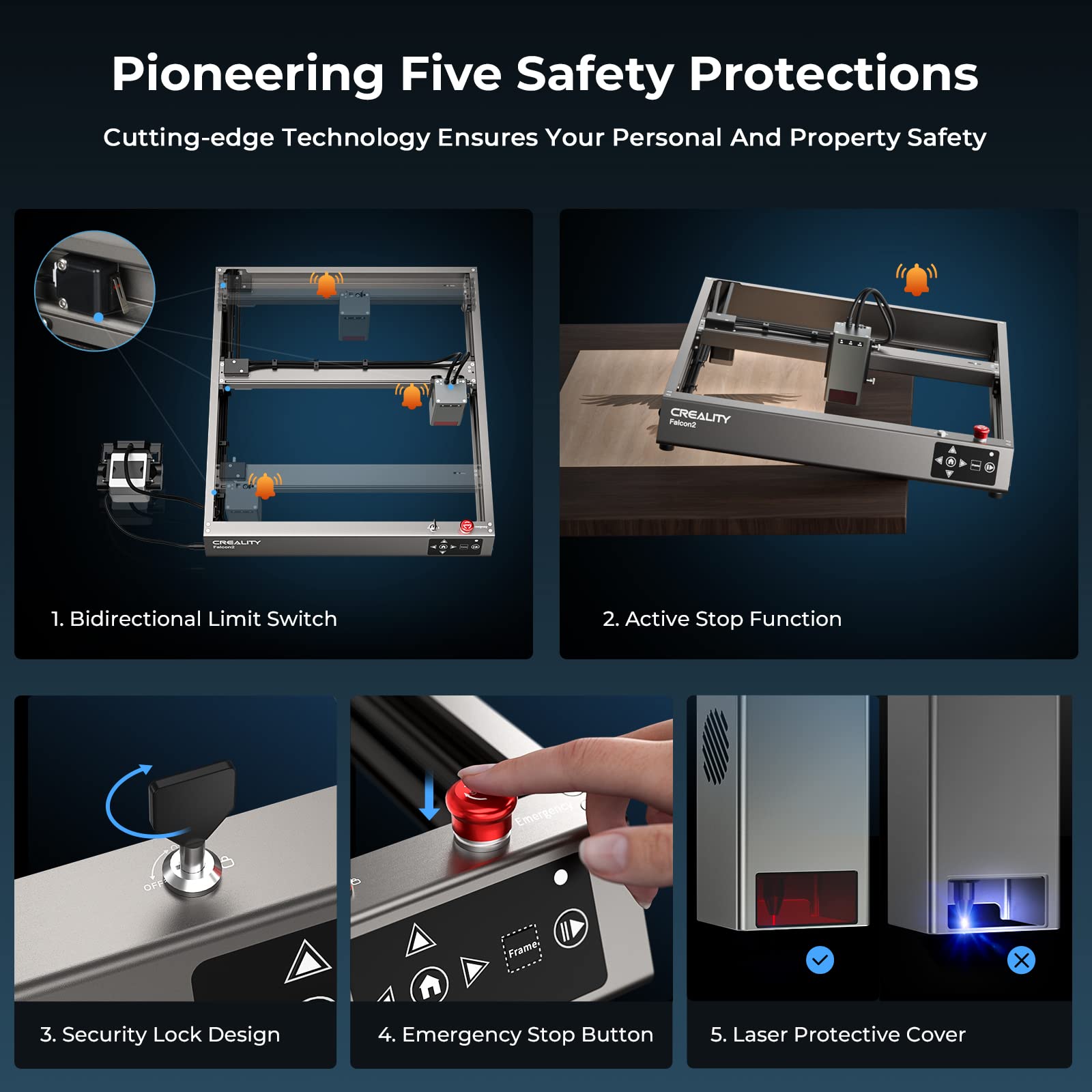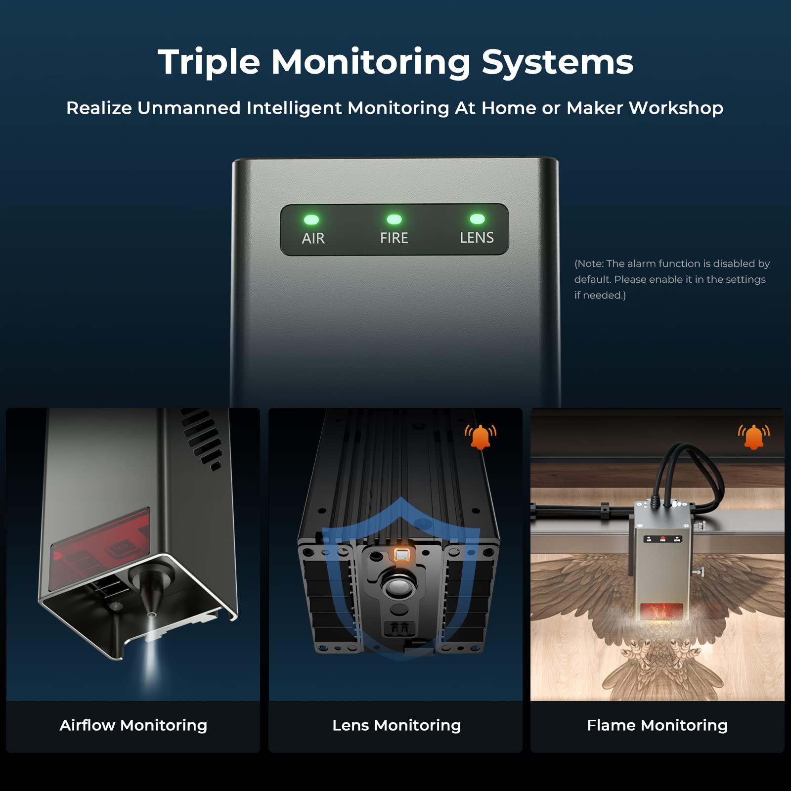 - Triple Intelligent Monitoring System - The Creality falcon 2 laser engraver has a triple intelligent monitoring system that includes airflow, flame, and lens monitoring. It reminds the user of the airflow size and stops the machine immediately if a flame is detected. The lens monitoring system triggers an alarm when the lens is dirty