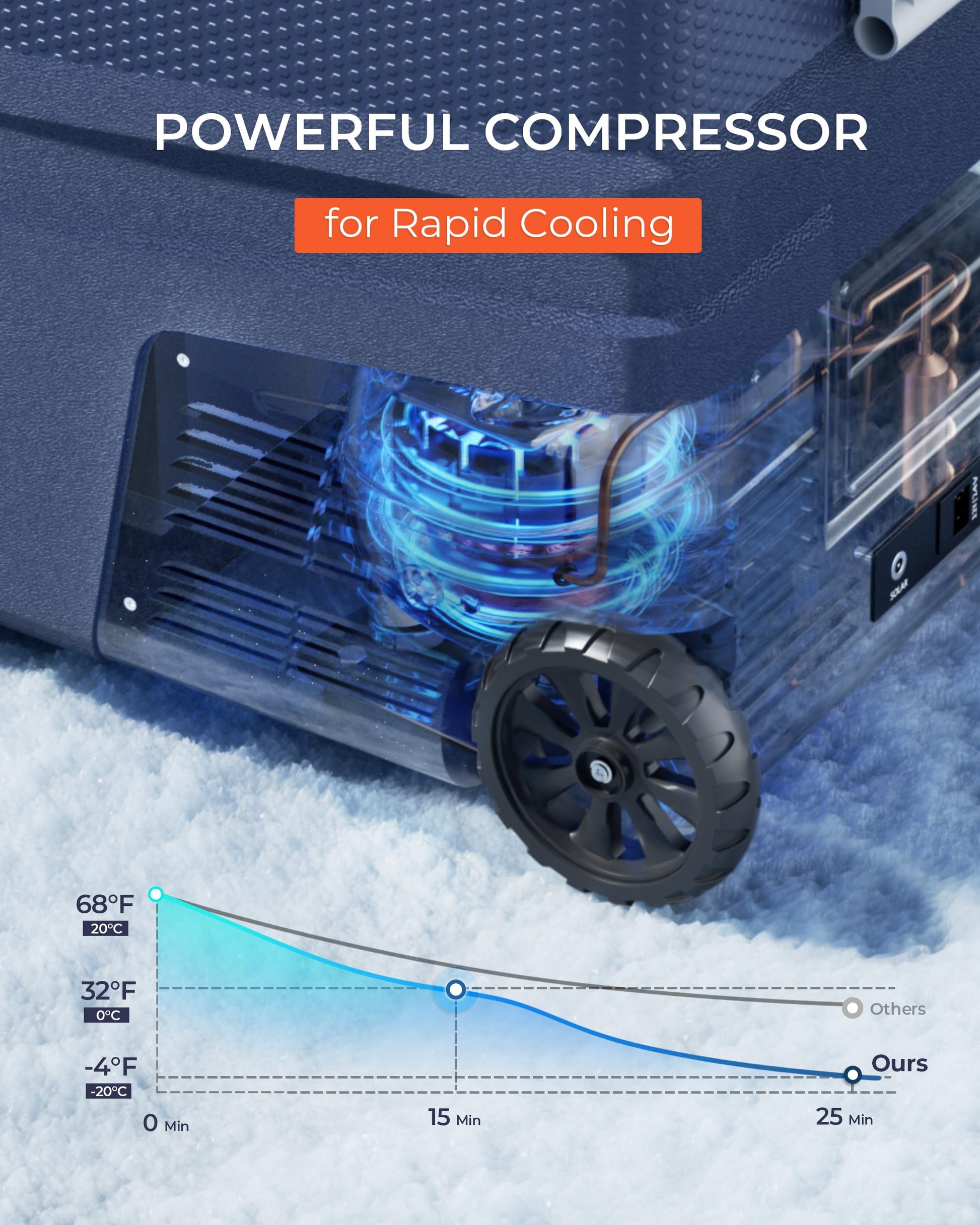 - Rapid Cooling & Battery Protection: This 12V car fridge uses advanced compressor technology for high efficiency, rapidly cooling contents from 68°F down to 32°F in just 15 minutes. With its 3-level battery protection system (L/M/H), it automatically safeguards your vehicle's battery against draining, making it perfect for worry-free use in trucks, RVs, and road trips