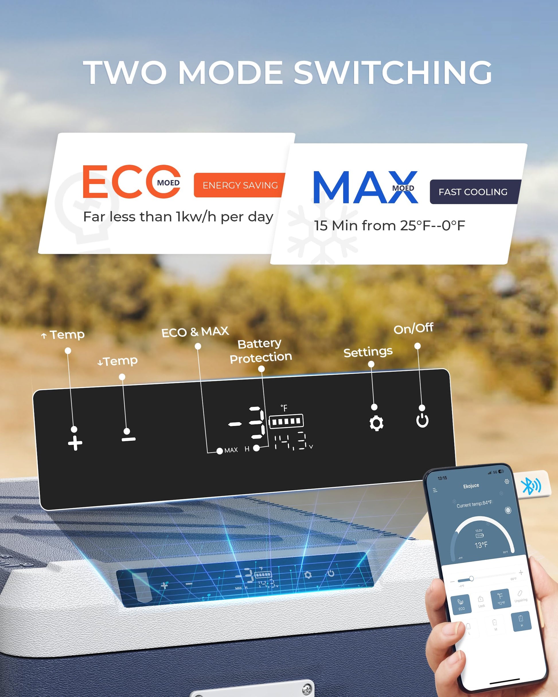 - ECO/MAX & Easy to Move: The car fridge freezer can switch between MAX mode (15-minute rapid cooling of beverages) and ECO mode, making it convenient for you to switch according to different needs. This 12v refrigerator features advanced shockproof technology, along with two foldable handles and sturdy wheels, making it convenient for you to use in dangerous terrains and freely explore