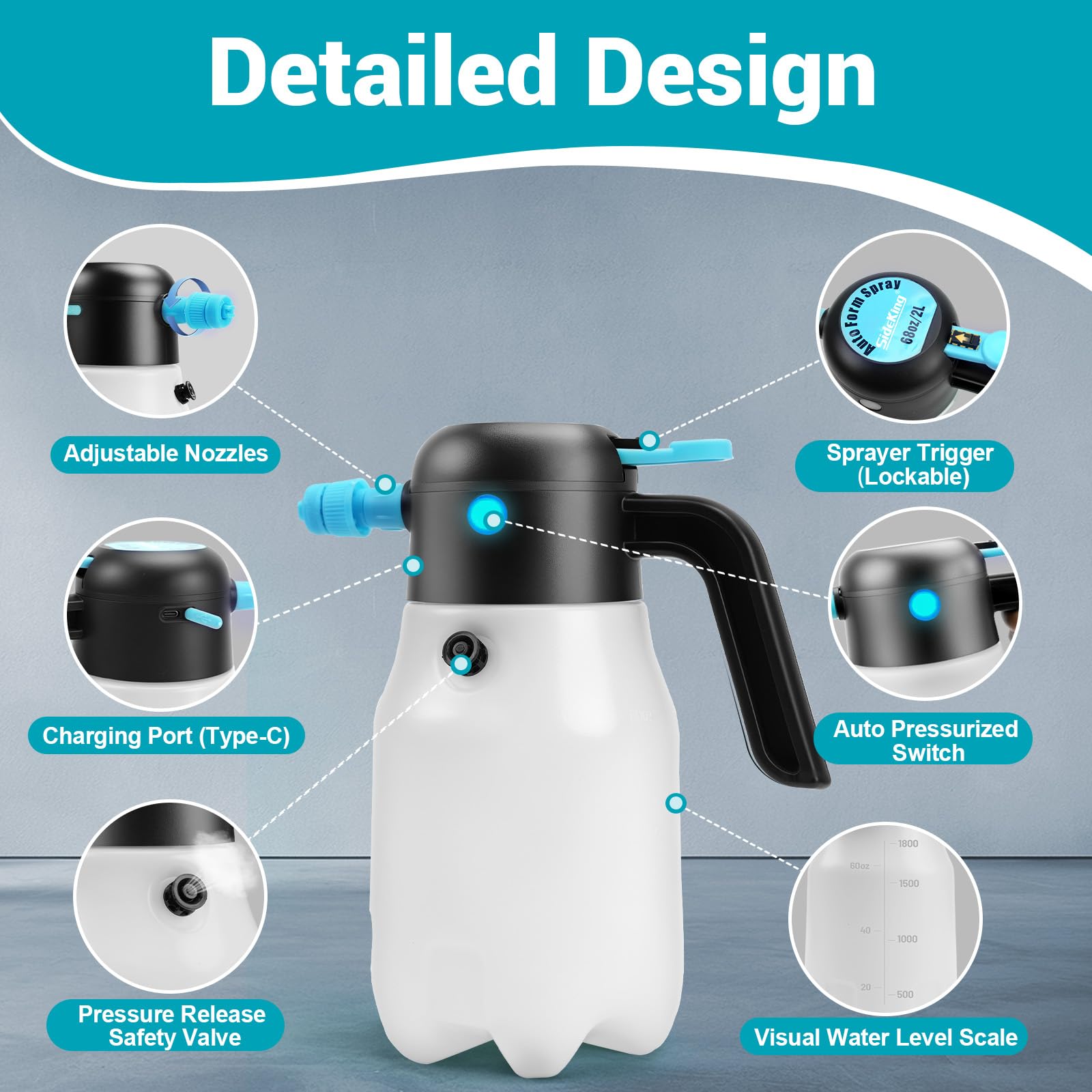 Electric Foam Sprayer Car Wash, 60PSI Foam Sprayer Auto Pressurized with 2 Nozzles(Foam/Water Stream), Built-in 7.4V Pump, 2x2000mAh Battery, for Car Wash, Window Cleaning, Garden&Home Use-68oz/2L