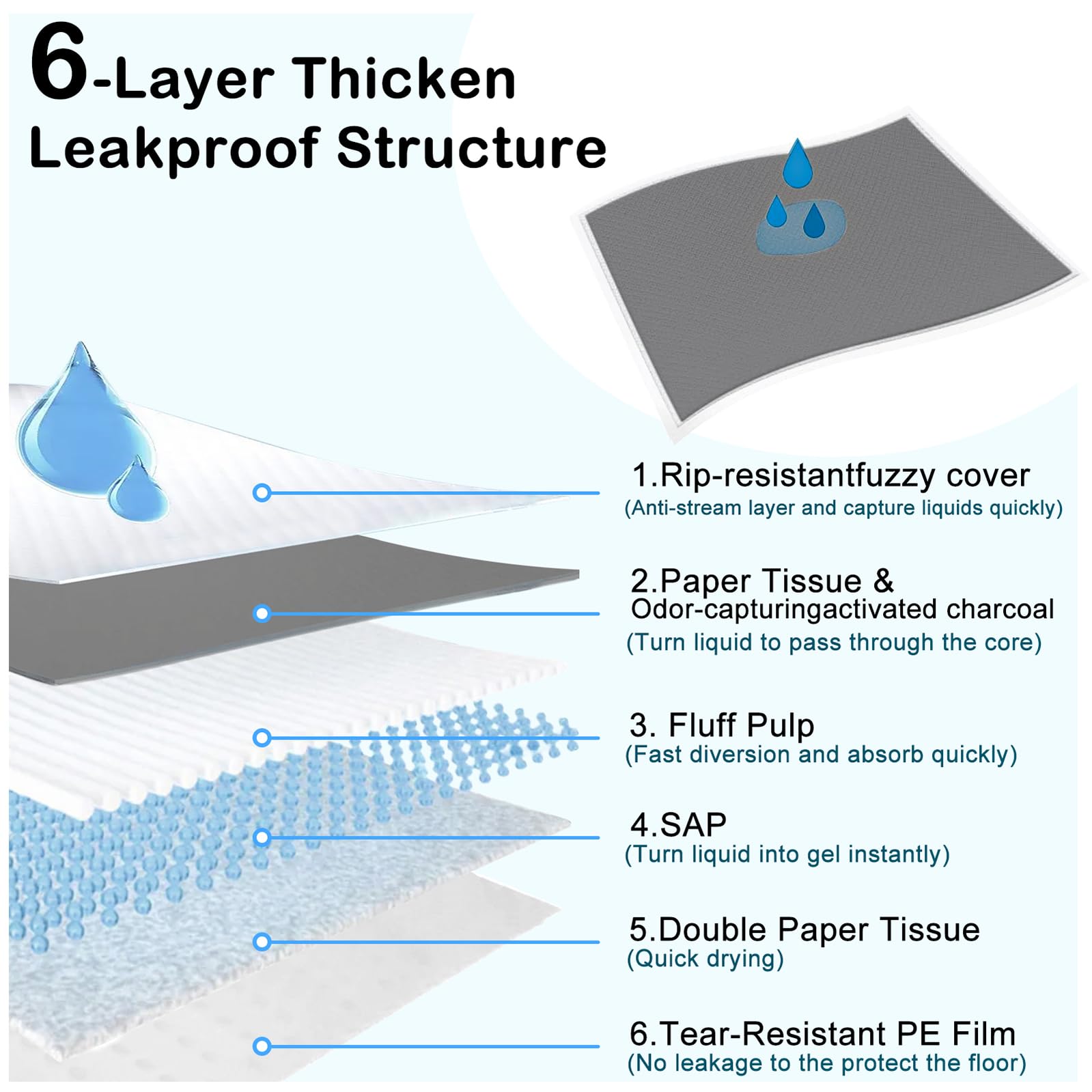 - 【Super Absorbent & 6-Layer Protective Design】ELEGX Pet Training Pads are always made with durable 6-layer construction. Powerful liquid-absorbent polymer technology makes each pad more absorbent than ordinary dog pads on the market. With an additional 12 grams of imported polymer material and 60 grams of fluffy pulp, the polymer core quickly turns urine into gel. Keep pets dry and clean throughout the day