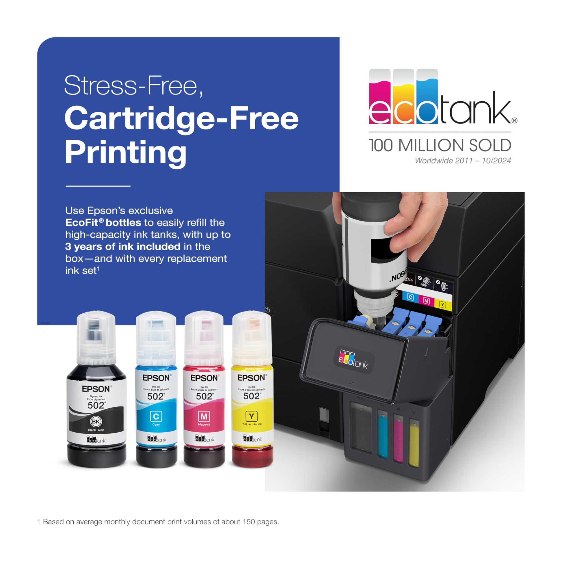 - INCREDIBLE VALUE — Epson EcoTank includes enough ink to last up to 3 years⁴. And if you run low, you’ll save up to 90% with replacement ink bottles vs. ink cartridges⁸