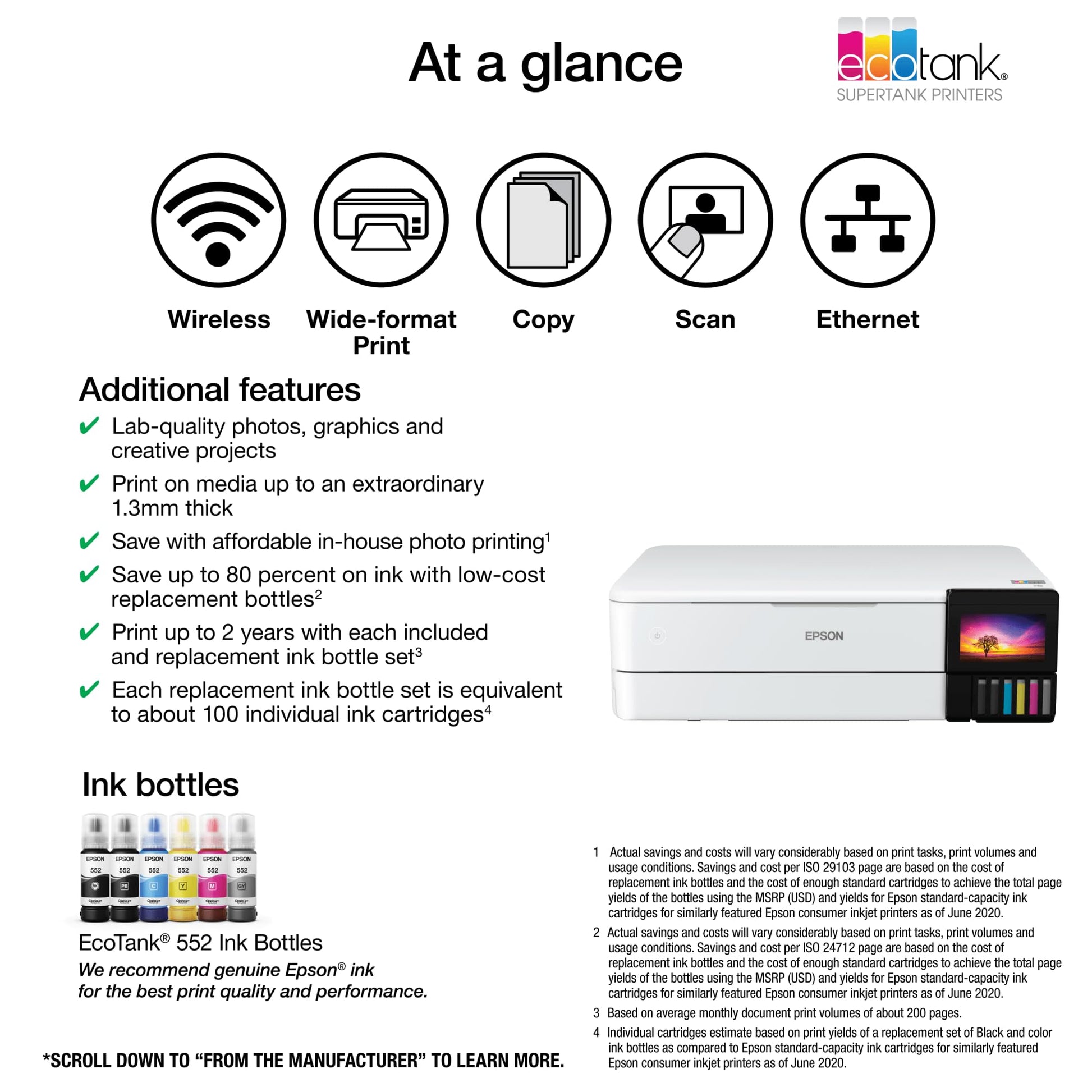 Details: The EcoTank Photo ET-8550 wireless all-in-one prints lab-quality, wide-format color photos, graphics and everyday documents — all at an incredible value. Epson’s cartridge-free, 6-color Claria ET Premium Ink system delivers vibrant colors and sharp text for all your creative projects. With low-cost replacement ink bottles, print 4' x 6' photos for about 4 cents each compared to 40 cents with cartridges (1). Print everything from borderless 13' x 19' photos to customized CDs/DVDs. You can even print on cardstock and other media up to 1.3 mm thick. For added convenience, each set of bottles lets you print for up to 2 years (2). Plus, save up to 80 percent with replacement ink bottles vs. ink cartridges (3) — that’s about $2,000 on each set (3). The EcoTank Photo lets you do it all with affordable in-house printing.