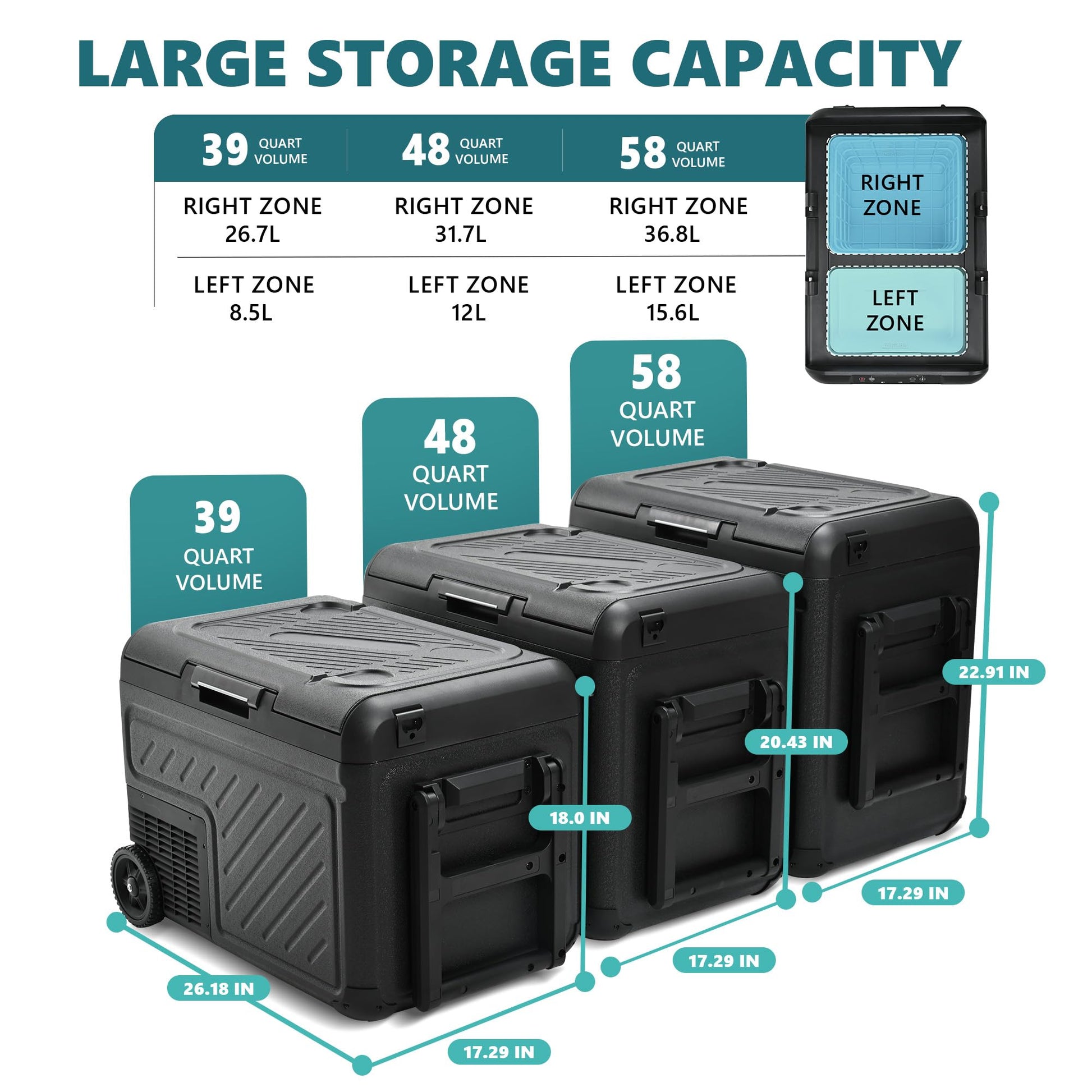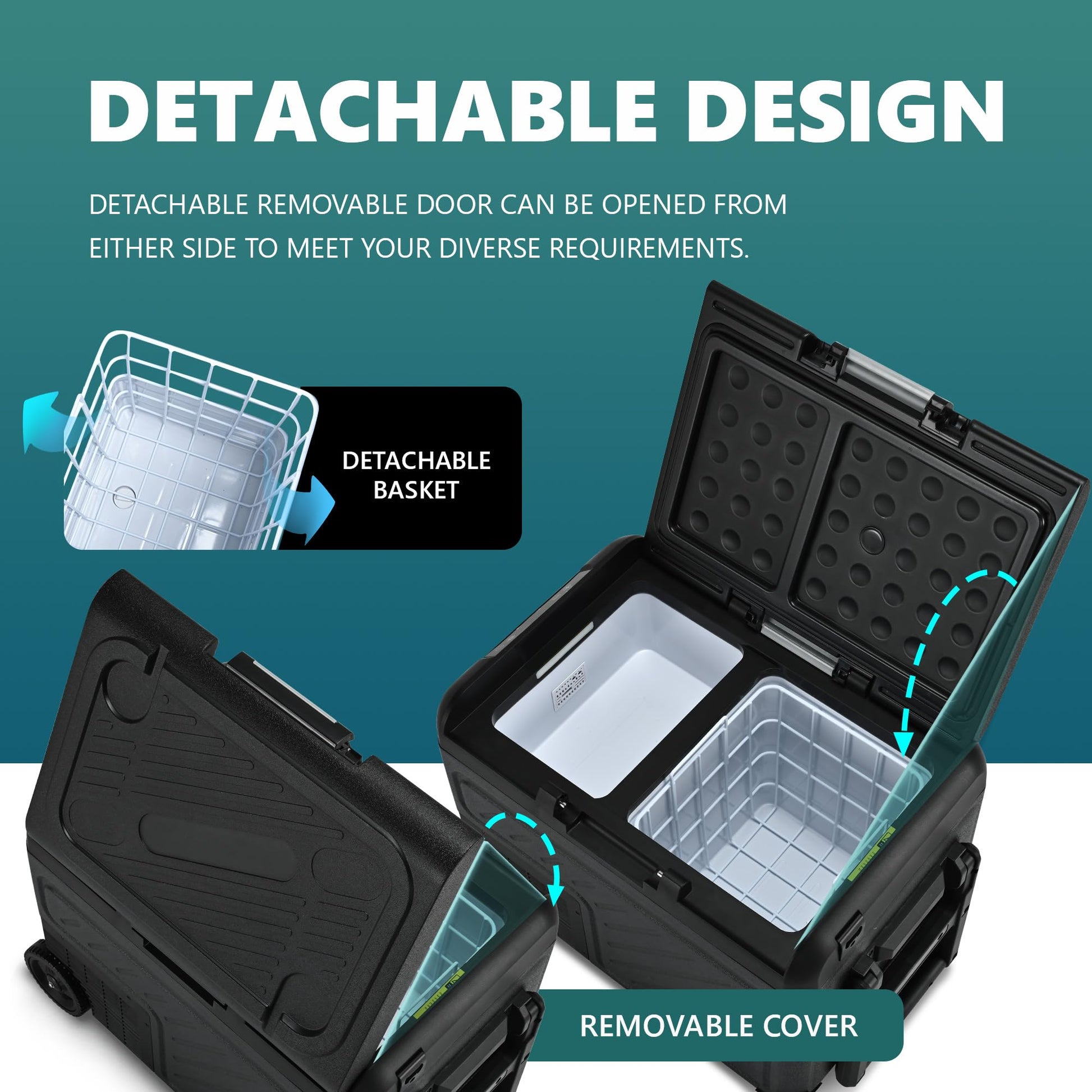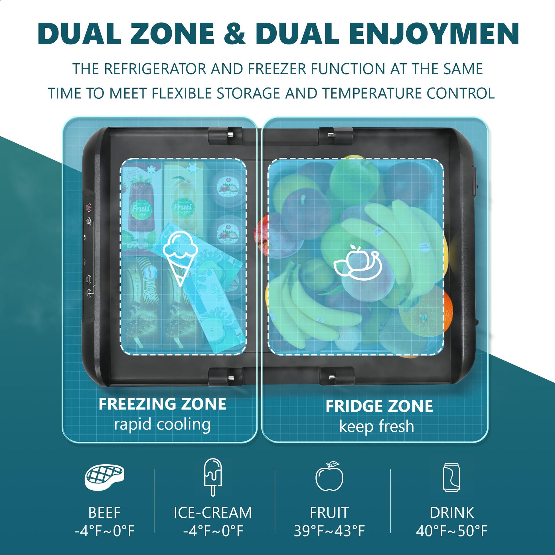 - Dual Zone & Dual Temp Control; Equipped with two separate compartments, this car fridge offers the flexibility to use one as a fridge and the other as a freezer, each with its own temperature settings. With removable baskets and dual reversible doors of the portable refrigerator, you can easily access and organize your items according to your needs, making your journey more convenient