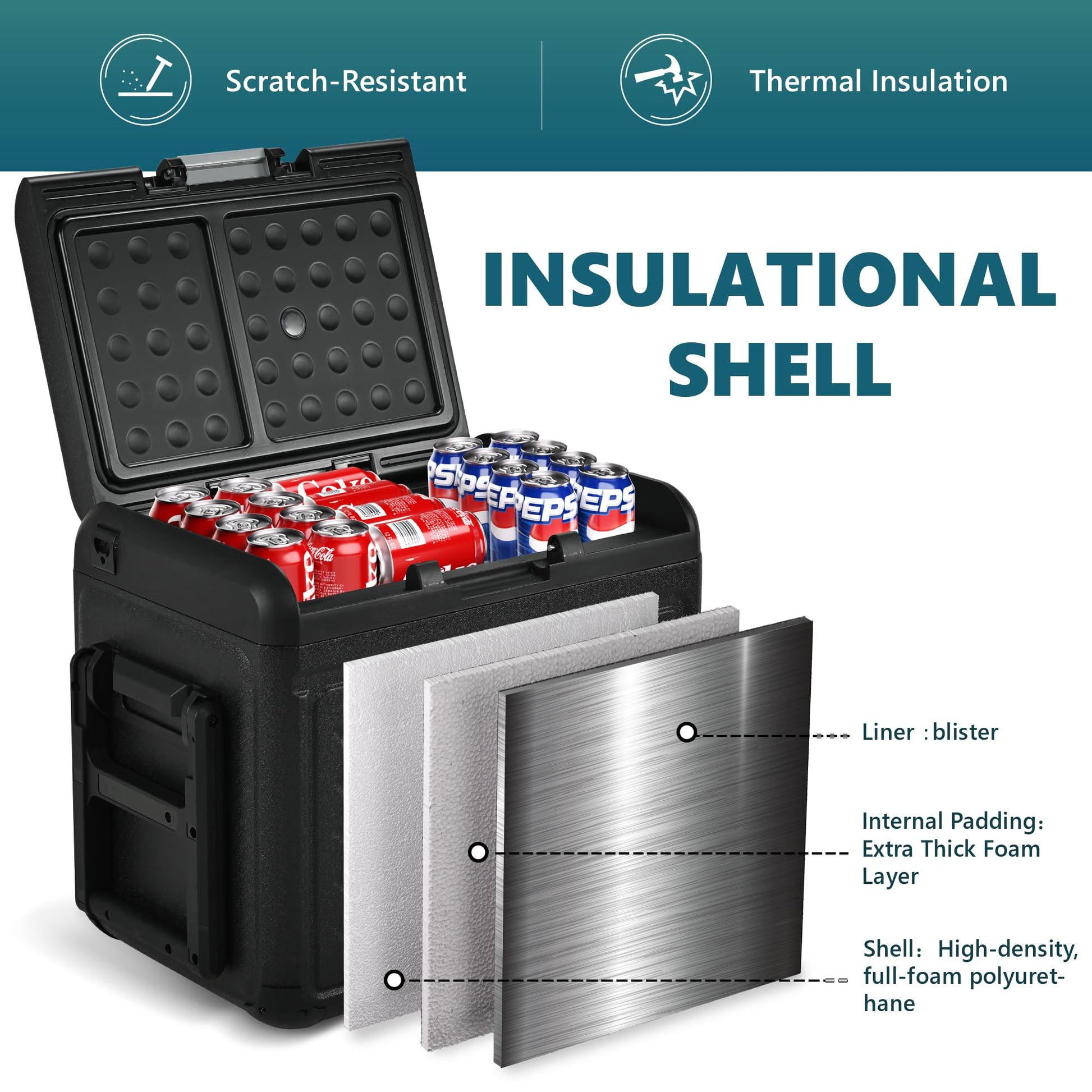 - Humanized Design & Portable Design; The electric cooler for camping features reinforced handles and off-road wheels, making it easy to transport. The user-friendly LED panel with clear buttons allows you to adjust the temperature range at any time. This 12 volt cooler is designed with shock-resistant technology, ensuring it functions properly even on rough slopes up to 40 degrees