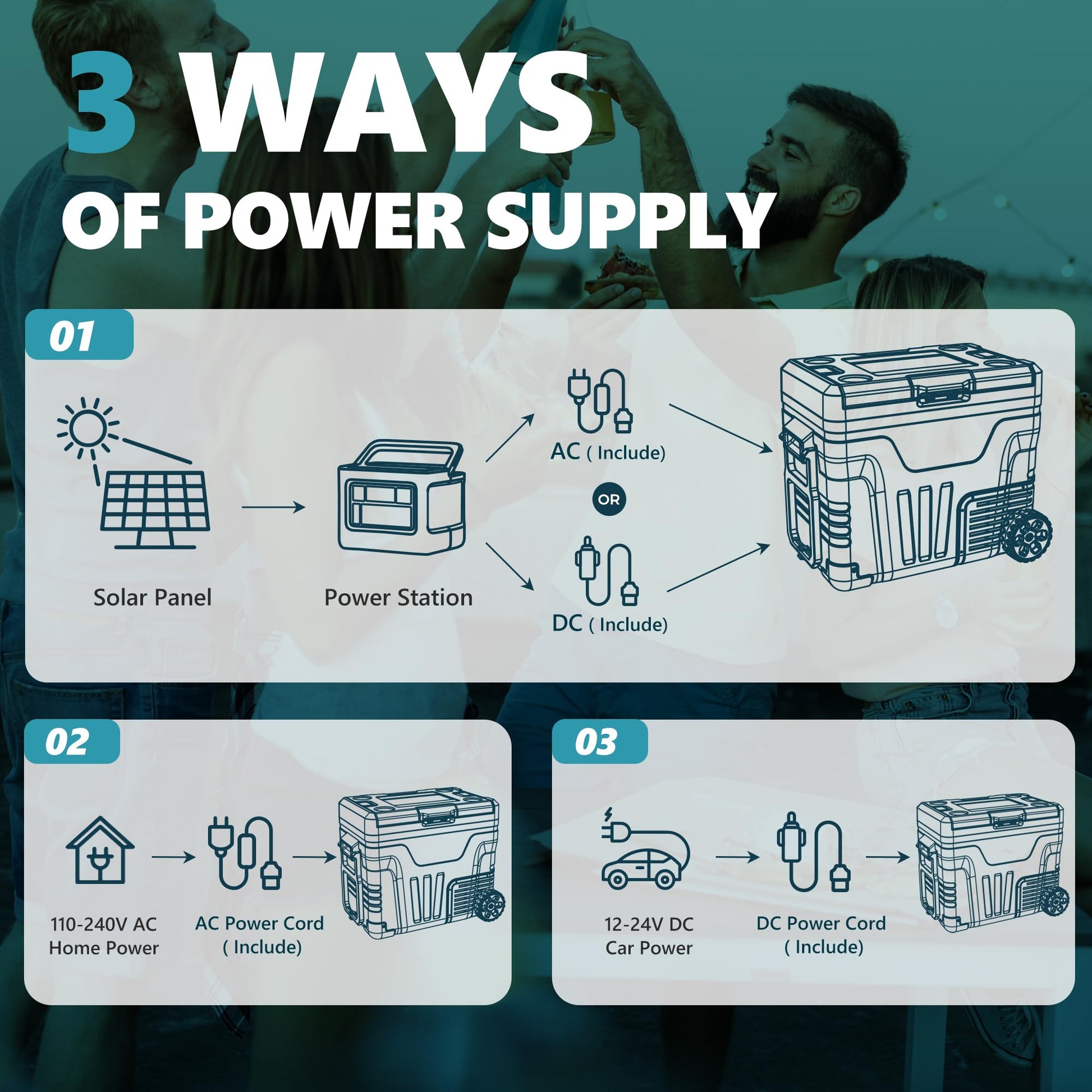 - Battery Protection & Multiple Power Supplies; This portable electric cooler offers 3-level battery protection, allowing you to adjust the input power between L/M/H modes to prevent overload or vehicle battery drain. The portable fridge can be powered by both DC and AC, making it suitable for various scenarios