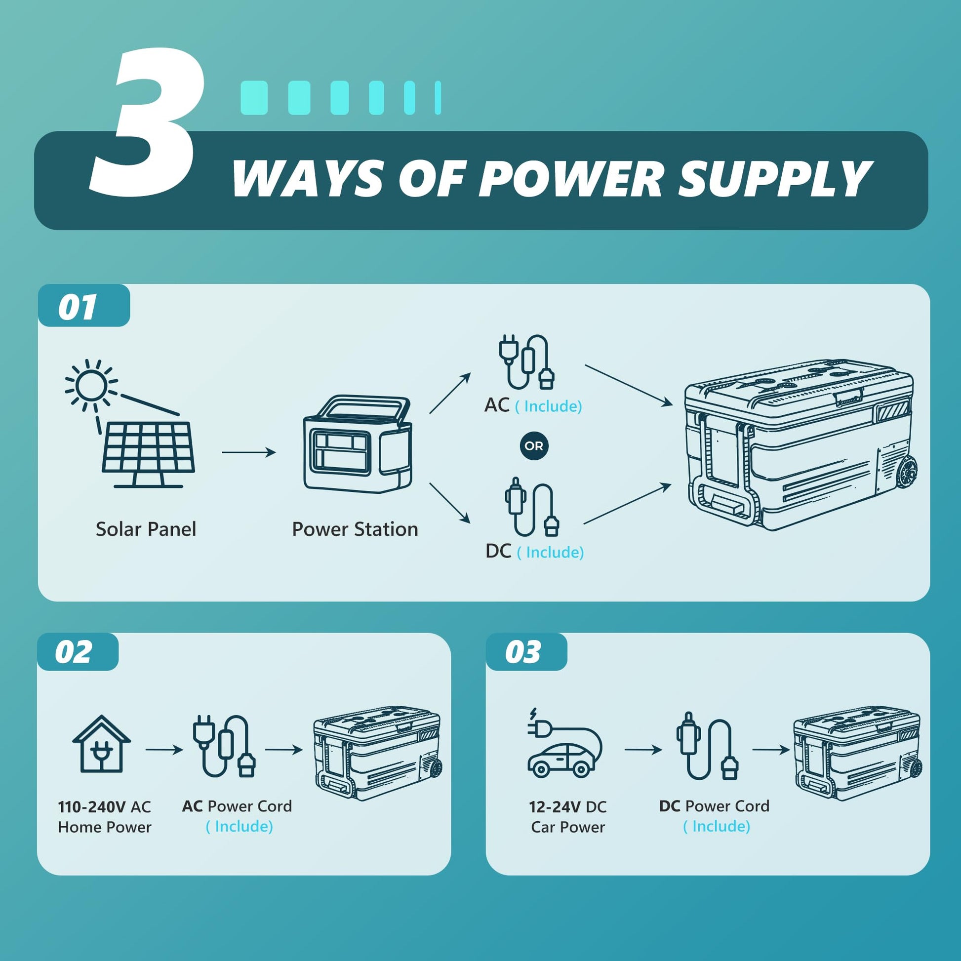 - Battery Protection & Multiple Power Supplies; The portable electric cooler freezer features a three-level battery protection system, adjustable from 9.6V to 12.4V in L/M/H modes, preventing overload or vehicle battery drain. This protection makes the car fridge suitable for use in sedans, SUVs, trucks, and most other vehicles. It can be powered by either DC or AC, making it versatile for various scenarios