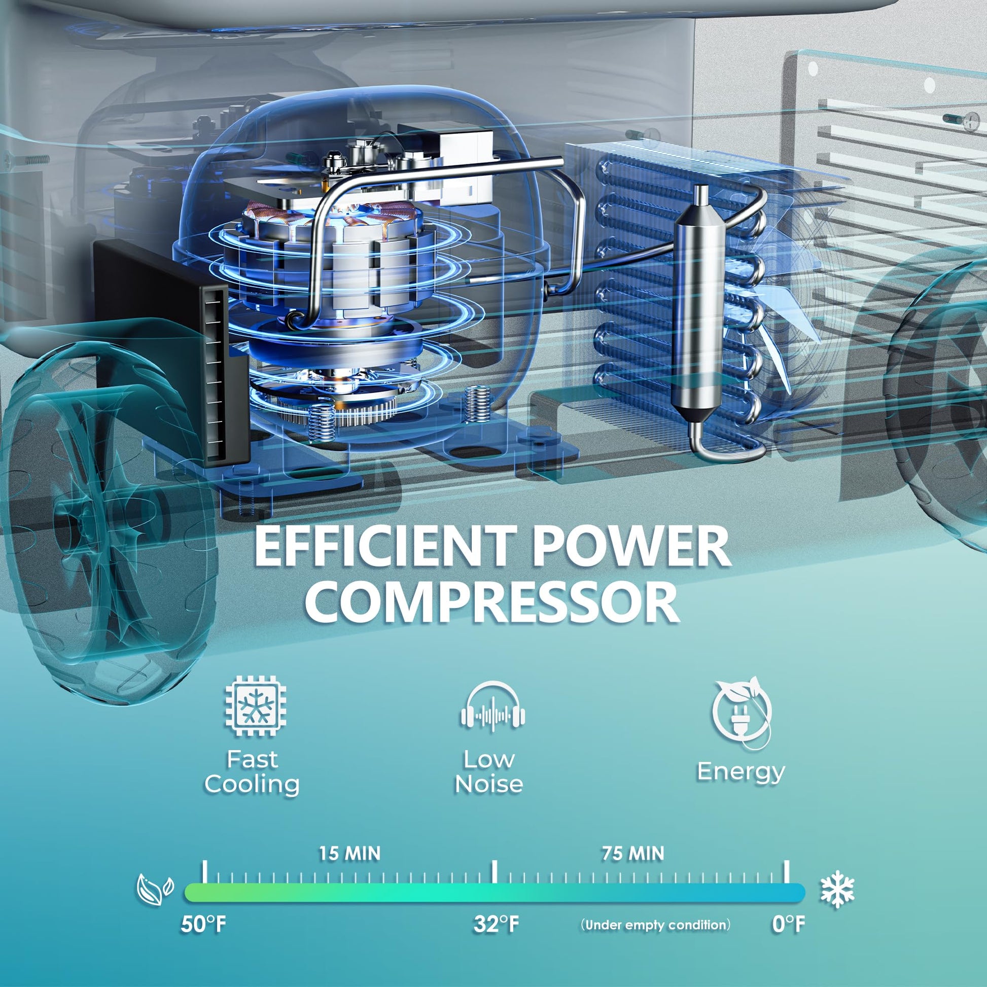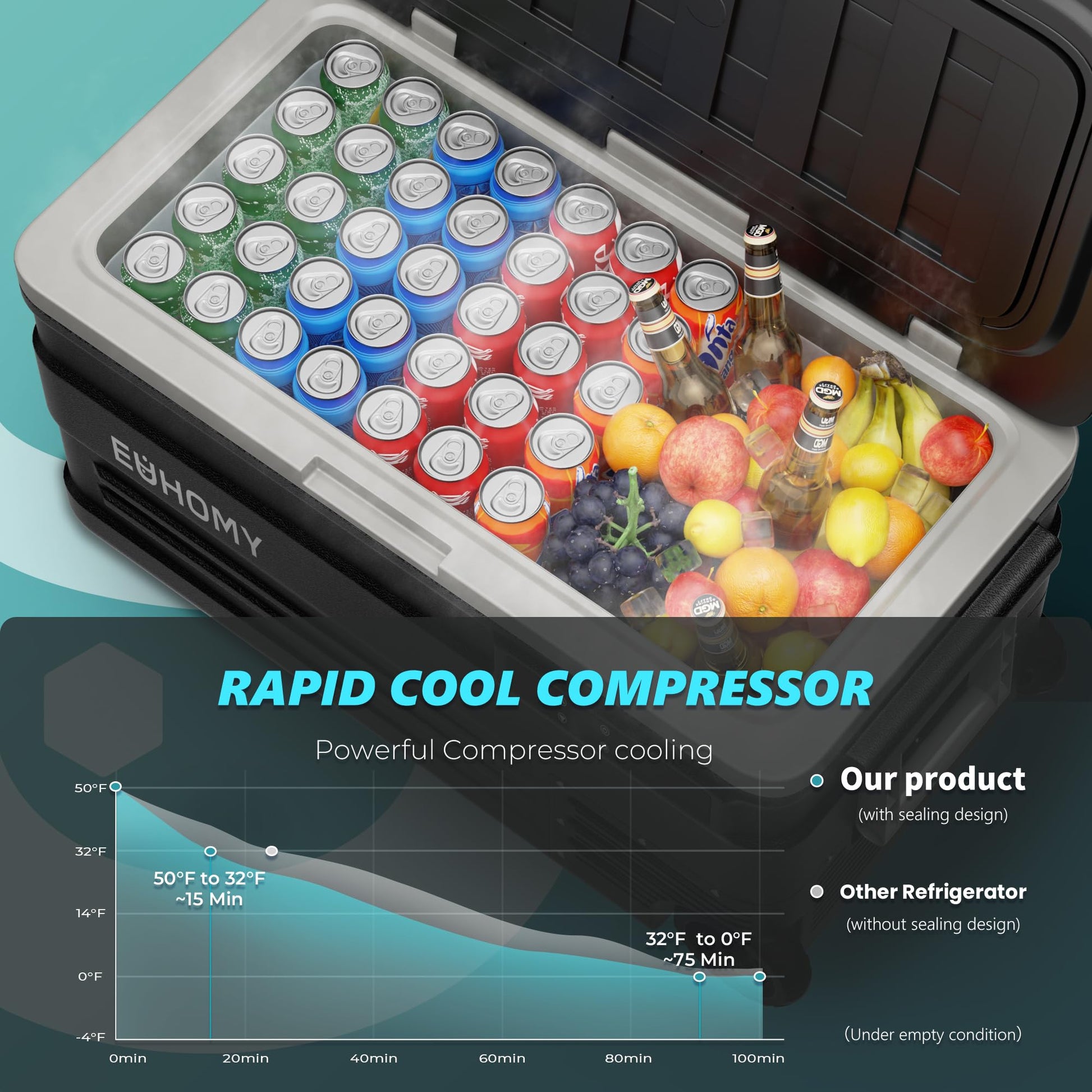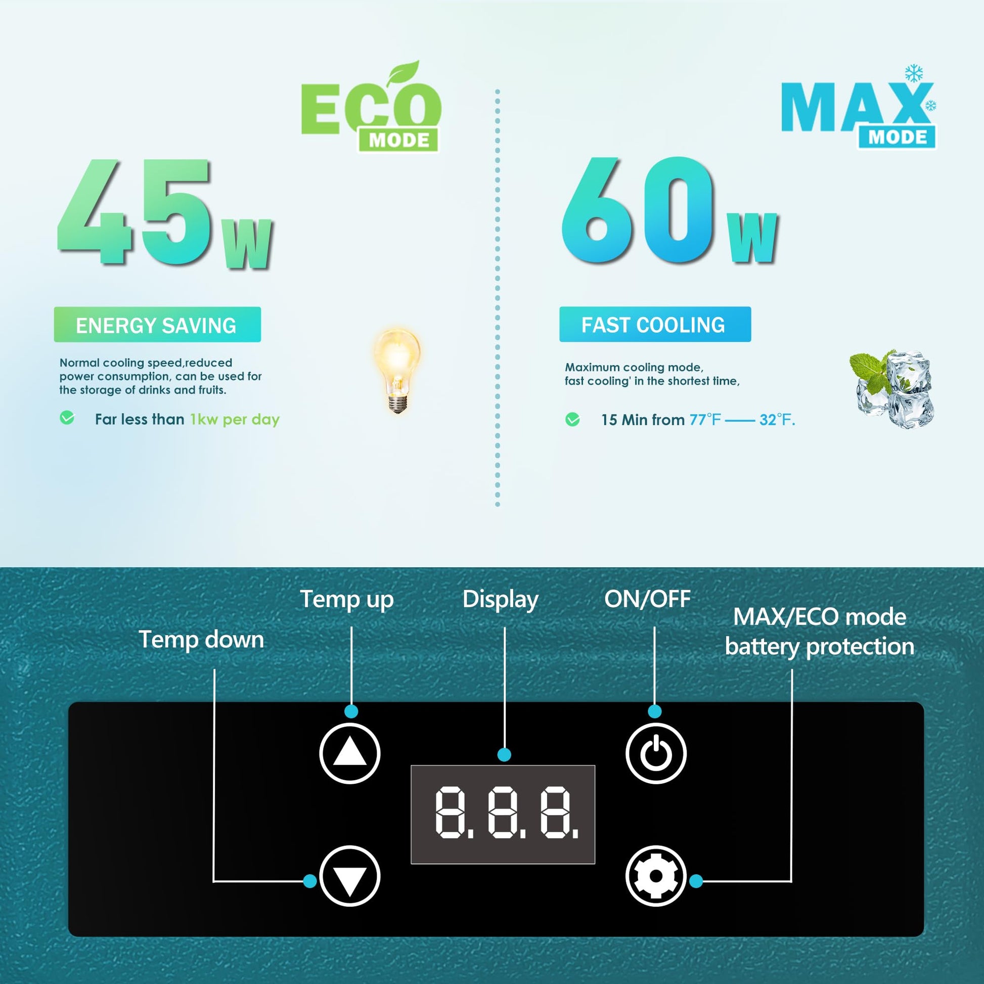 - Powerful Compressor & Excellent Insulation; The portable freezer is equipped with a high-efficiency variable frequency compressor, offering powerful cooling and a temperature range from 0°F to 68°F. UL energy-certified, the 12 volt cooler features both ECO and MAX cooling modes, consuming only 45W. The 40mm thick insulated, durable exterior ensures optimal temperature maintenance