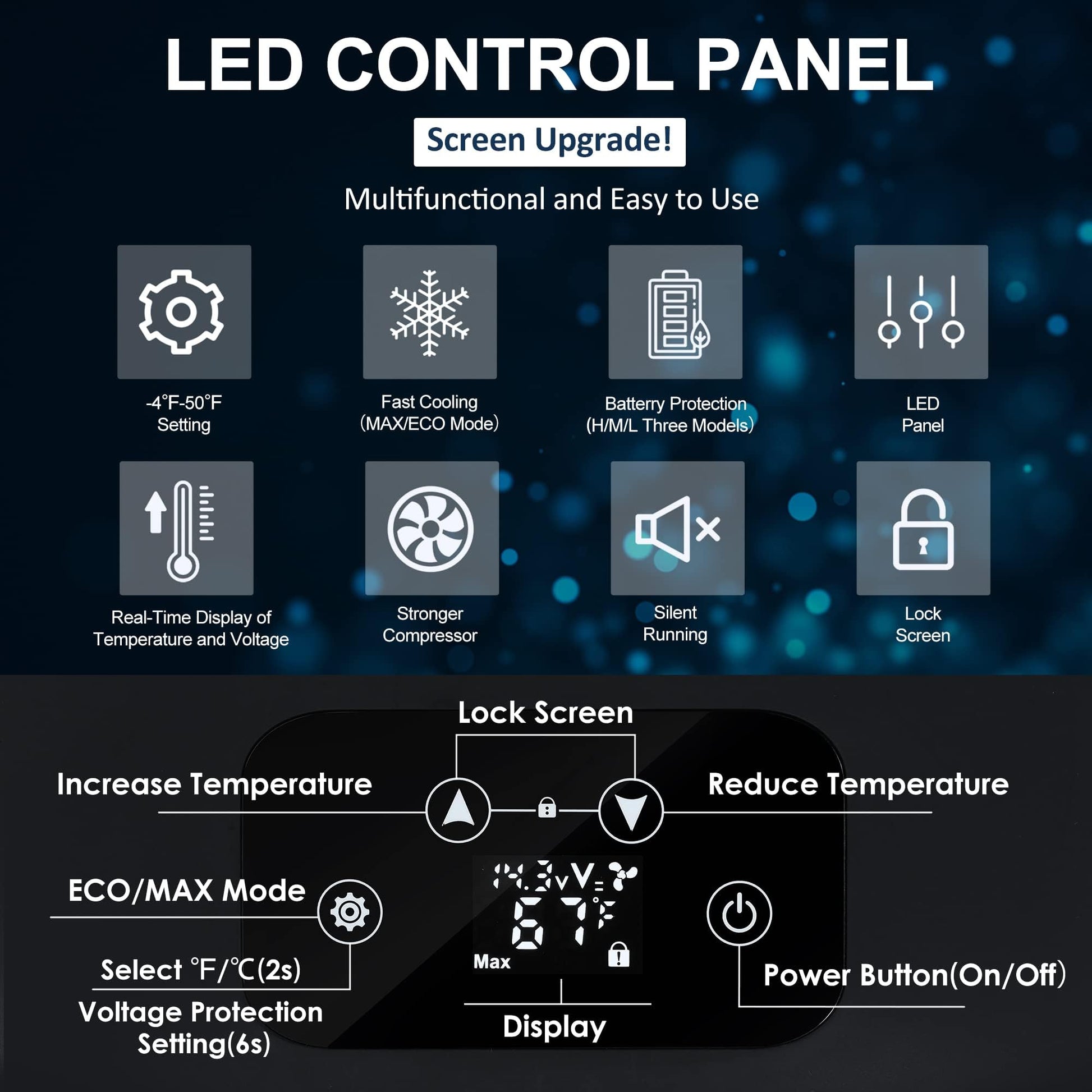 - LCD Panel & Lock Screen; The LCD panel on the 12v fridge is easy to operate, with clear buttons for adjusting the temperature range at any time. You can set any temperature between -4℉-68℉ on the panel. The car cooler has a lock screen function to prevent children from accidentally pressing the screen while traveling