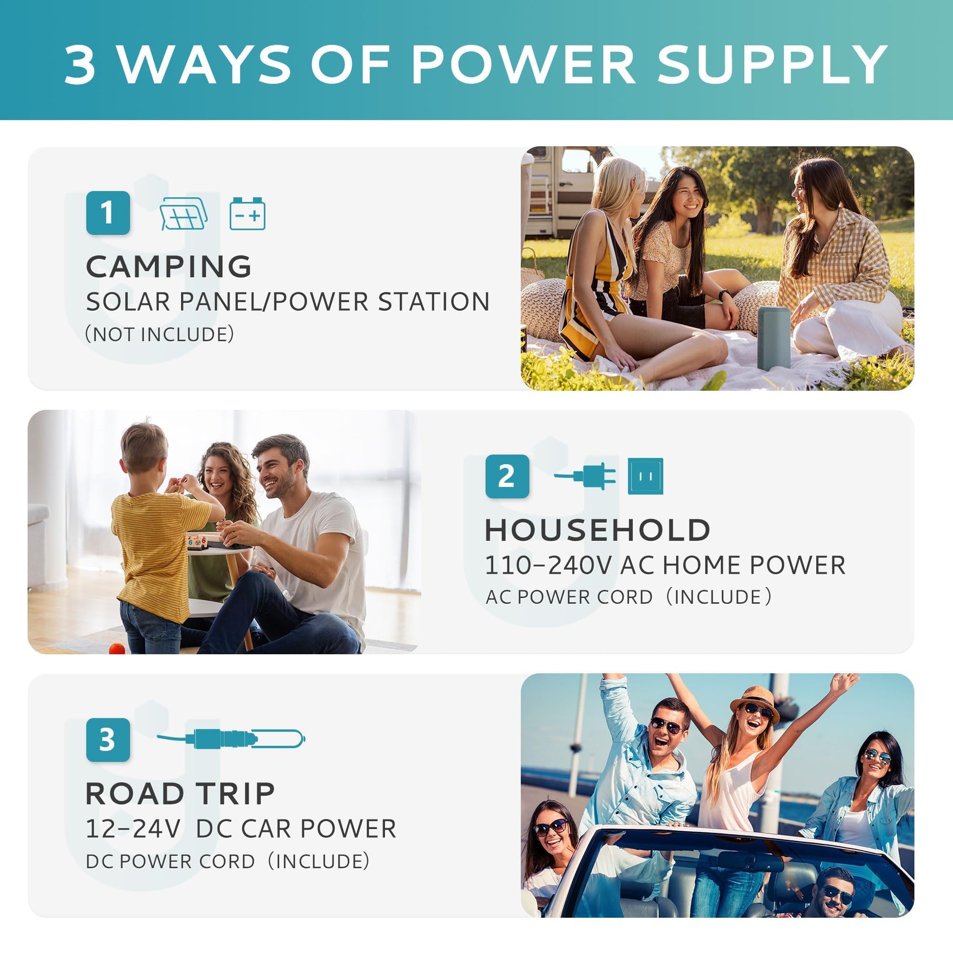 - Battery Protection & Multiple Power Supplies; This car freezer offers 3-level battery protection, allowing you to adjust the input power between L/M/H modes to prevent overload or vehicle battery drain. The portable fridge can be powered by both DC and AC, making it suitable for various scenarios