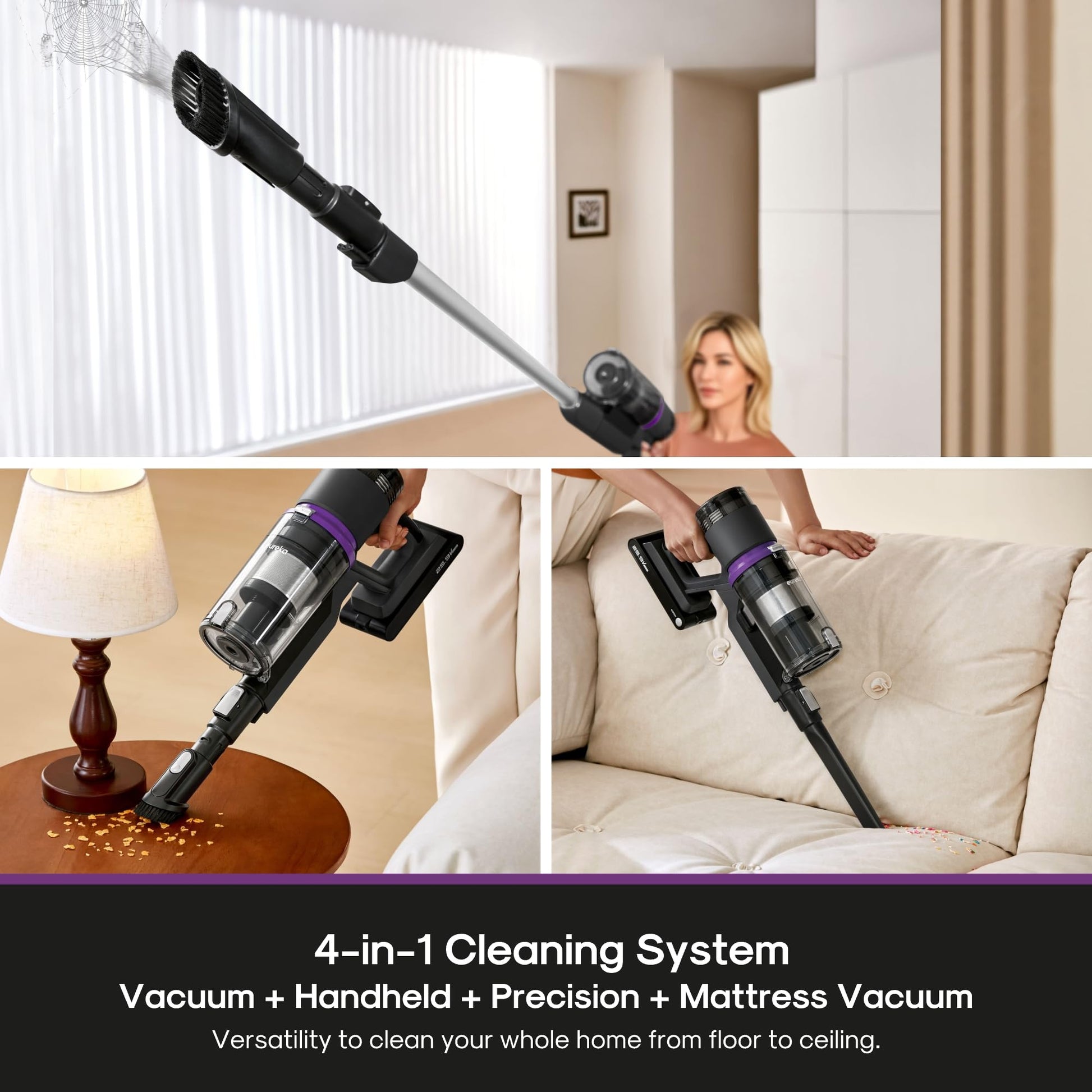 Details: The Eureka ReactiClean 410 is a sleek, lightweight cordless stick vacuum designed to deliver power and performance where it counts. With 20.3 kPa suction, an efficient BLDC motor, and up to 50 minutes of runtime, it’s engineered for real-life messes—pet hair, dust, daily debris—across every room of your home.