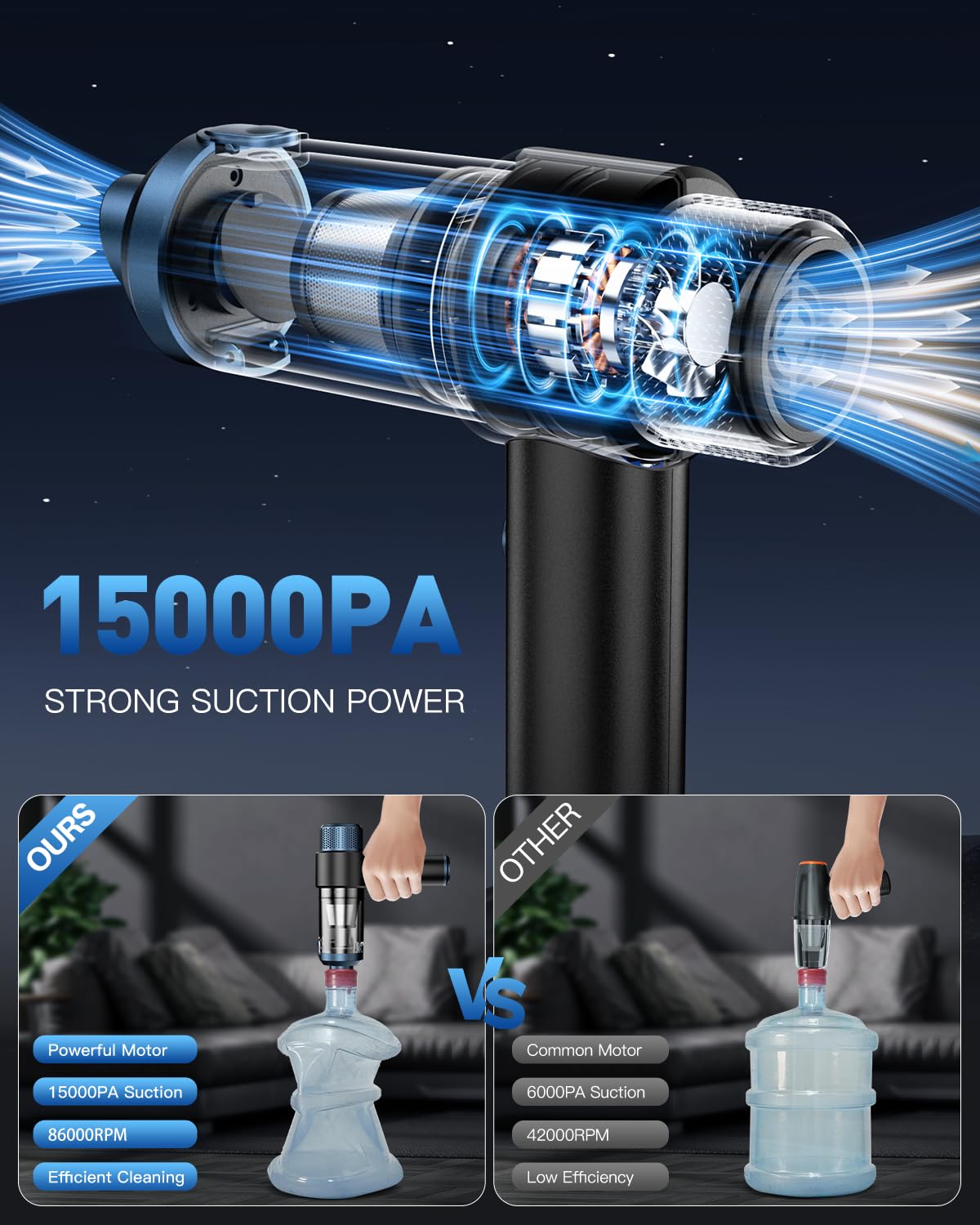 - đăPowerful 15000PA SuctionăPowerful motor of the hand held vacuum cleaner has 86,000RPM and provides up to 15000PA of suction power. Whether it's a sofa or carpet in your home, or the interior of your car, it's easy to clean. The rapid heat dissipation function can expel heat in a short period, making the motor more durable and long-lasting. The operating sound is as low as 40dB, so you can clean quietly without disturbing others