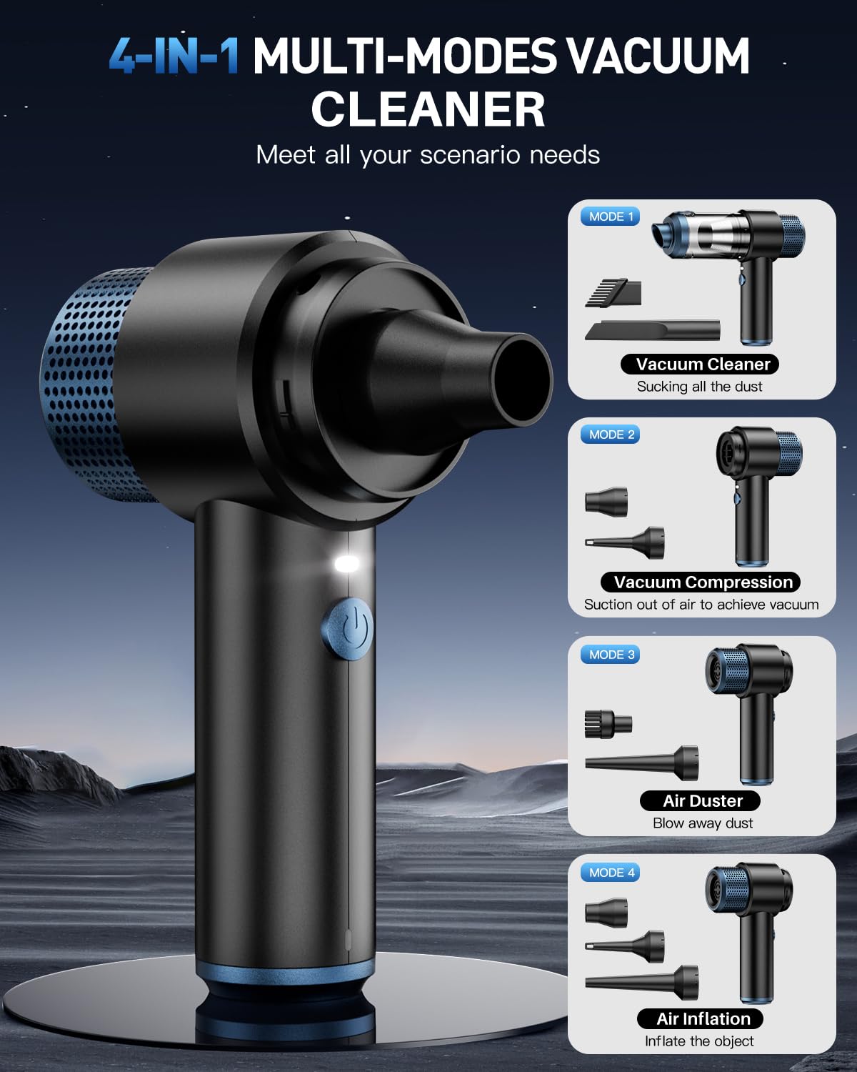 - đ ă4-IN-1 Car Vacuum CleanerăHandheld Vacuum cleaner used with 7 accessories can be used to get 4 modes of suction, blowing, inflation and vacuum compression to meet your different use scenarios. Floor brush and nozzle brush can easily suck up all kinds of debris. Blowing nozzle can be used to blow away dust from keyboards and narrow crevices. Two sizes of universal nozzles can quickly inflate or expel air from objects such as swimming rings, mattresses, etc