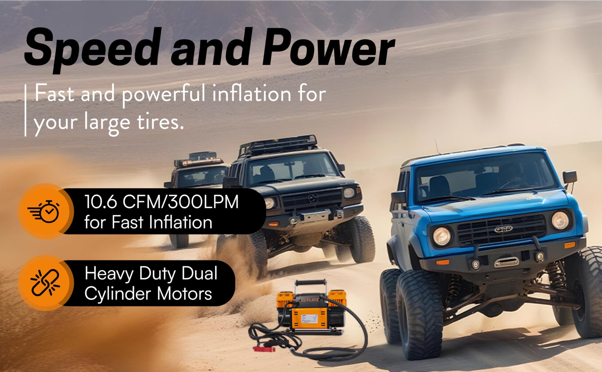 - SPEED AND POWER: Our 10.6CFM/300LPM Dual Cylinder Motors provide fast and powerful inflation for your large tires. Designed for heavy duty jobs making it perfect for Overlanders and Crawlers.