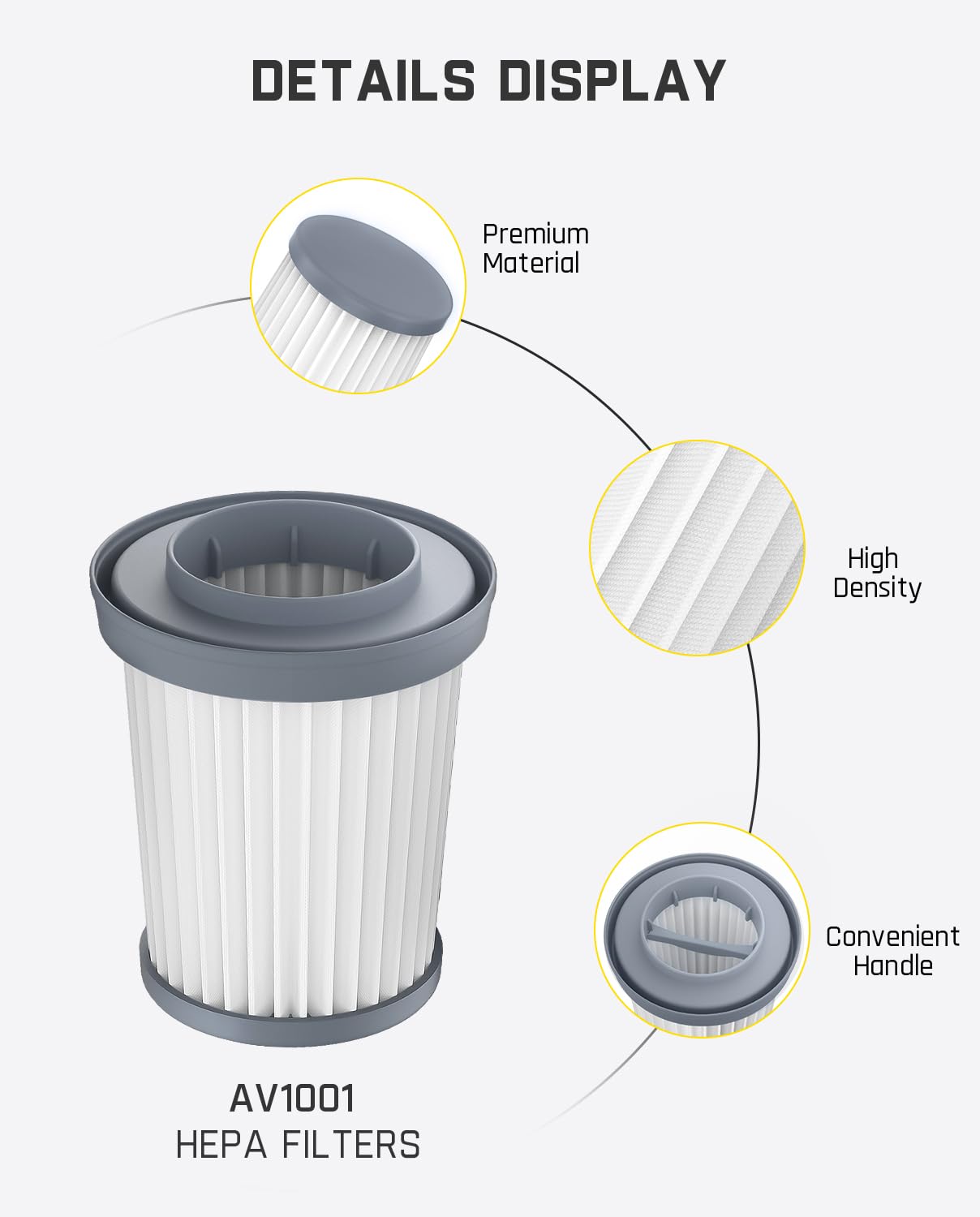 - Washable & Reusable: Filter can be pulled out from pre-filter. AV1001 Filters can be easily washed and easy to install, just take apart the dust cup, rotate and take out the HEPA filter replace the new filter