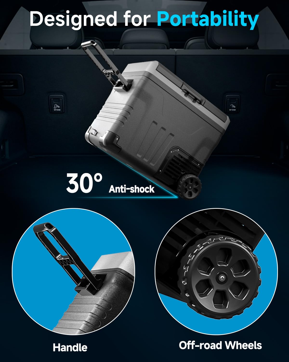 - 【Designed for Portability】 - Take your portable fridge wherever you go with the ergonomic double handles and off-road wheels, capable of stable operation even at a 30-degree incline. The sleek, black exterior not only looks good but is built to last, making it perfect for outdoor enthusiasts and travelers. Additionally, our user-friendly LCD touch panel offers you the convenience of adjusting temperatures, ensuring that your items are perfectly preserved.