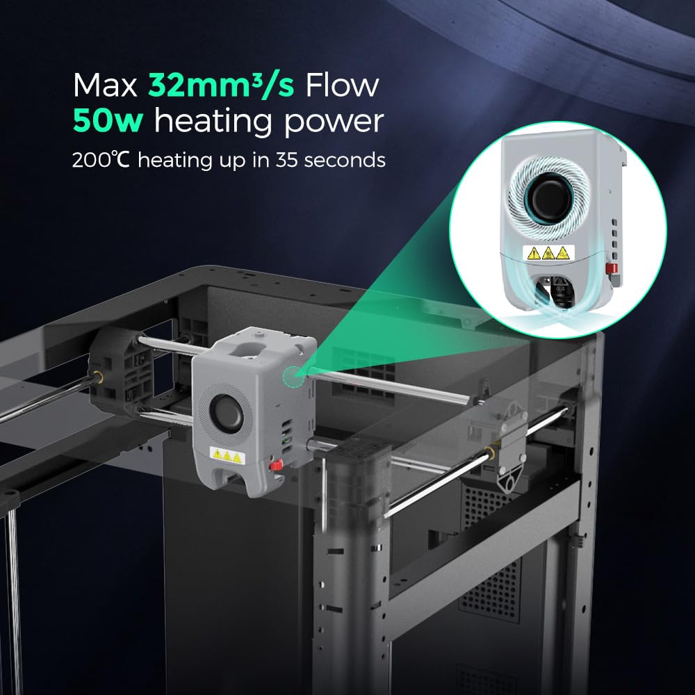 - 【Vibration Compensation&Less Waiting Time】Vibration compensation, eliminating ghosting in prints. Nozzle with a flow of 32mm³/s, 50w heating power, 200℃ heating up in 35 seconds. Precise and consistent extrusion for smooth and no-blur prints.
