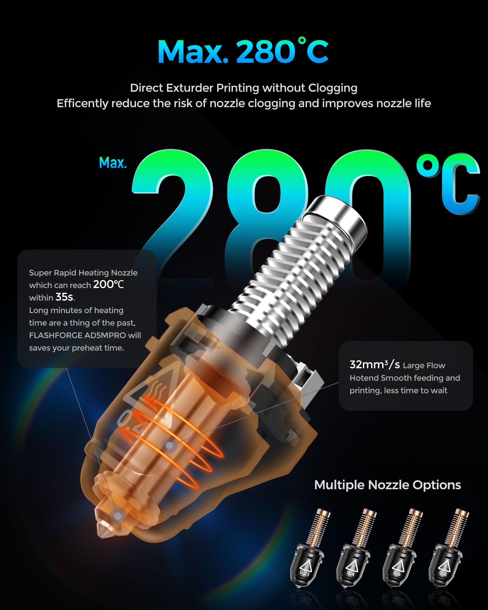 - High Success Rate: Max 280°C Direct Extruder, 32mm³/s large flow hot end,35s heat to 200°C, to ensure that the consumables are fully melted during high-speed and high-temperature printing, built-in vibration compensation, eliminating ghosting in prints; this printer is equipped with a powerful nozzle fan and an auxiliary fan within the cavity to effectively cool printed models, preventing wire drawing and deformation with utmost efficiency