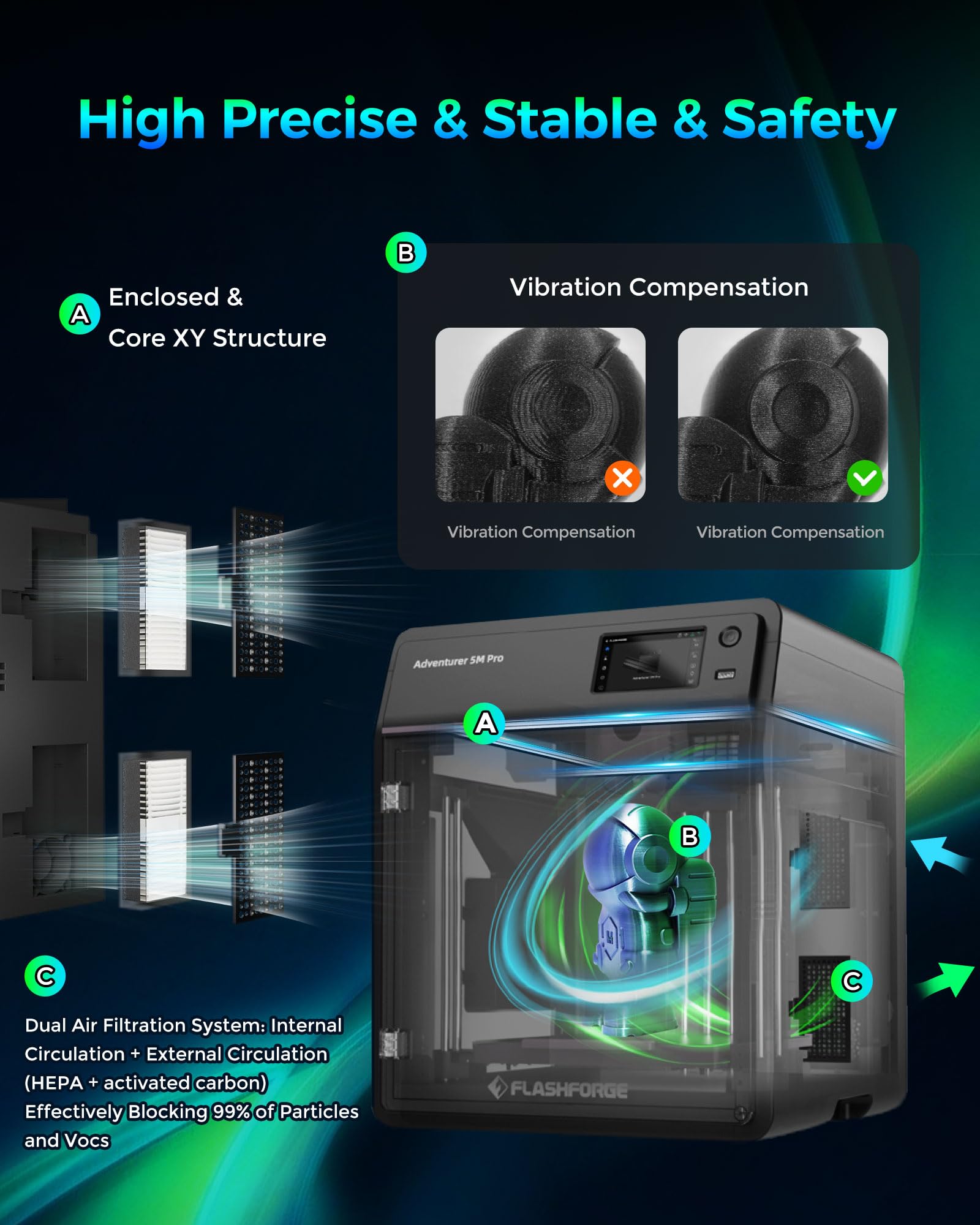 - Enhanced 12X Faster Printing: 50db Low Printing noise, Adventurer 5M Pro 3D Printer is designed for efficiency, the core XY structure ensure stable at max.speed of 600mm/s and 20000mm/s² Acceleration.Enclosed 3D printer equipped with a dual filtration system of internal and external, effectively blocking 99% of particles and VOCs, protecting respiratory system