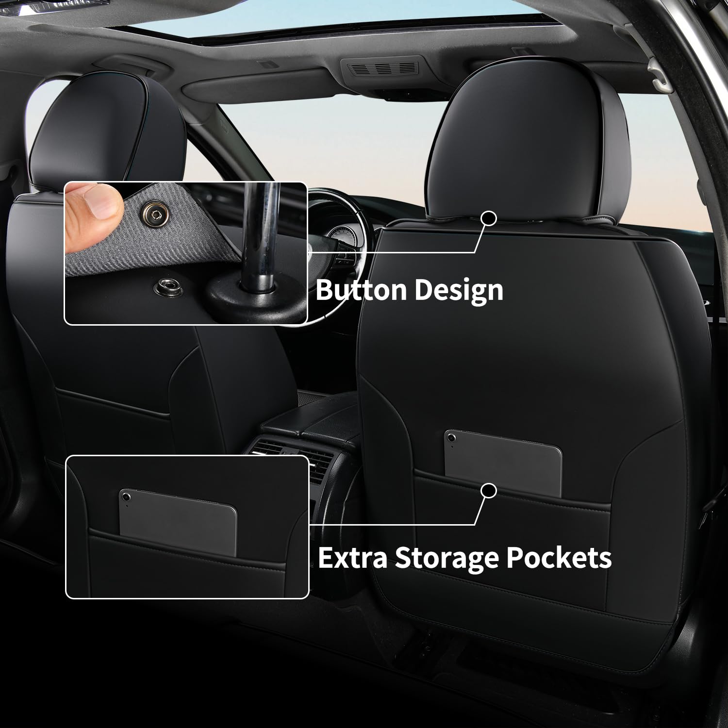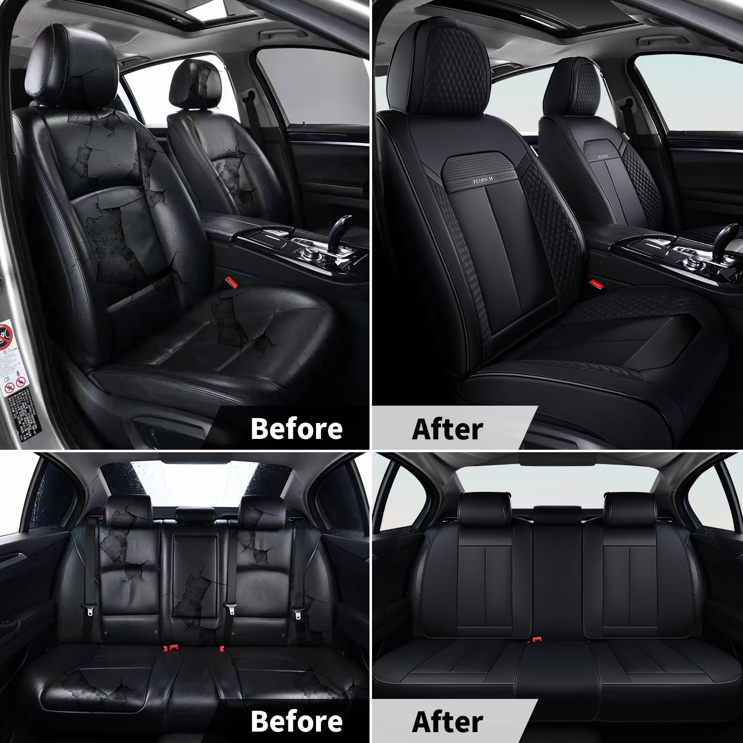 - 【Premium Leather Material】The seat cover is made of nappa leather crafted design fabric, which is softer to touch, more durable and breathable. It prevents the seats from being damaged by pet claws, keys and other sharp objects, and the waterproof surface protects your car seats from any stains or spills. The high resilient sponge padding in the cushion enhances driving comfort, fits perfectly, prevents wear and tear, and is not easy to tear.