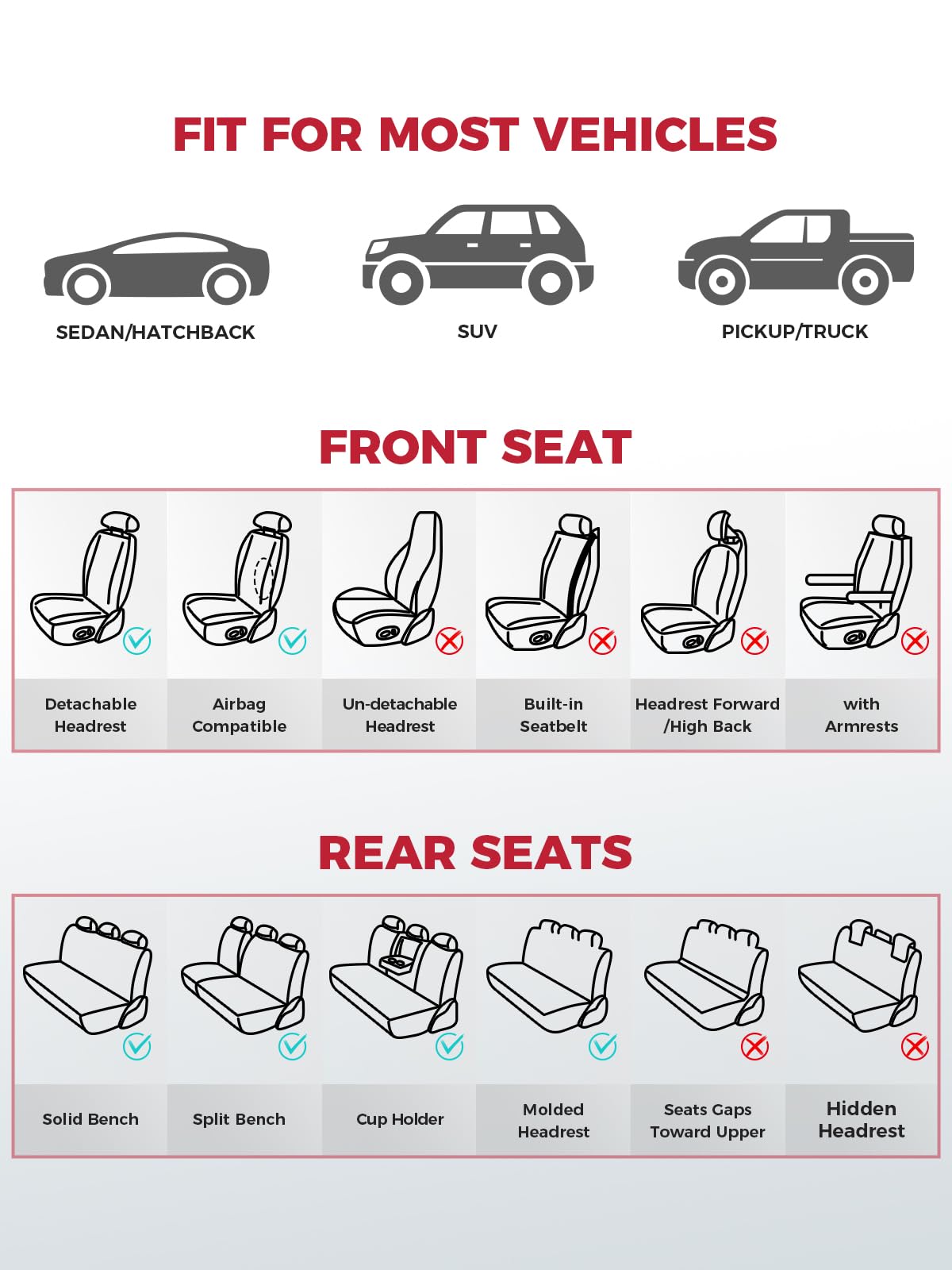 - Universal Fit, Hassle-Free Style: FREESOO Car Seat Covers fit most cars, SUVs, and trucks, giving your interior a custom upgrade without the fuss. Just check the model list on our main image for a perfect match.