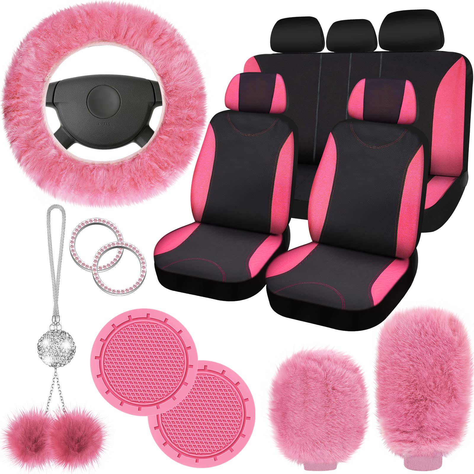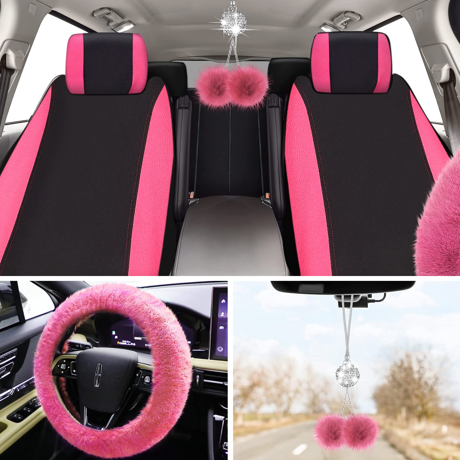 Fulmoon 17 Pcs Car Seat Cover Full Set for Women Universal Fit Car Front Rear Fluffy Steering Wheel Fleece Handbrake Shift Covers Hanging Accessory Holder Ring Emblem(Pink Black)