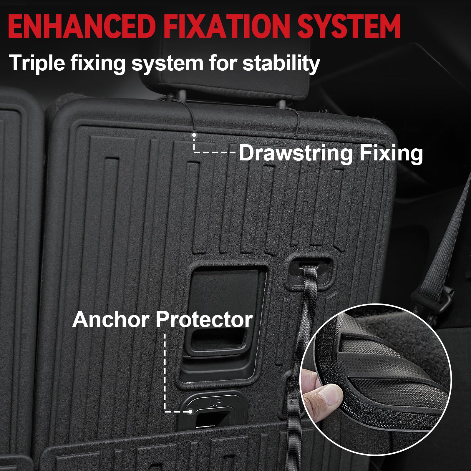 - Triplex Fixation: The rear seat covers hook-and-loop to grip securely to the seat back. Attached drawstring and top tether protectors reinforce seatback installation