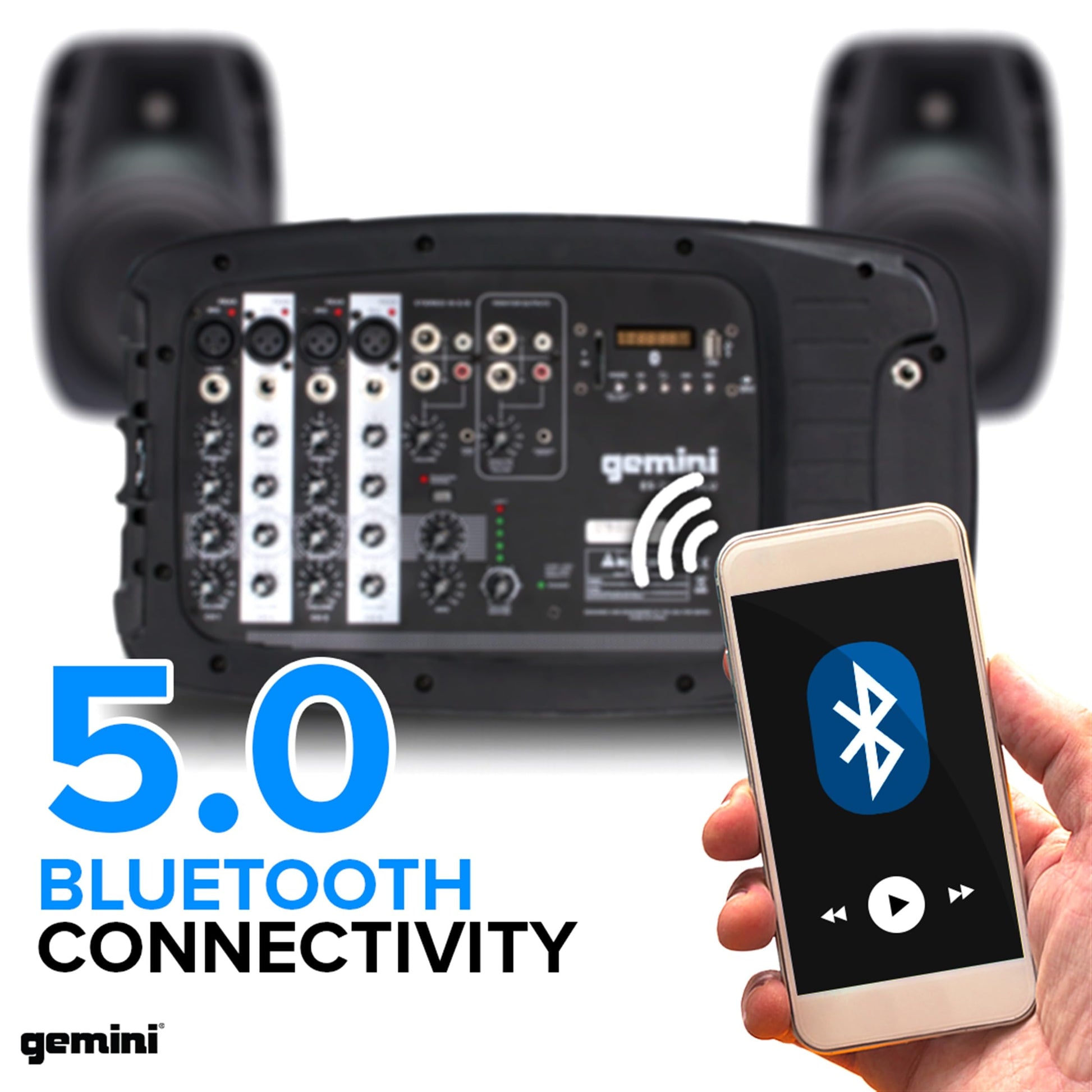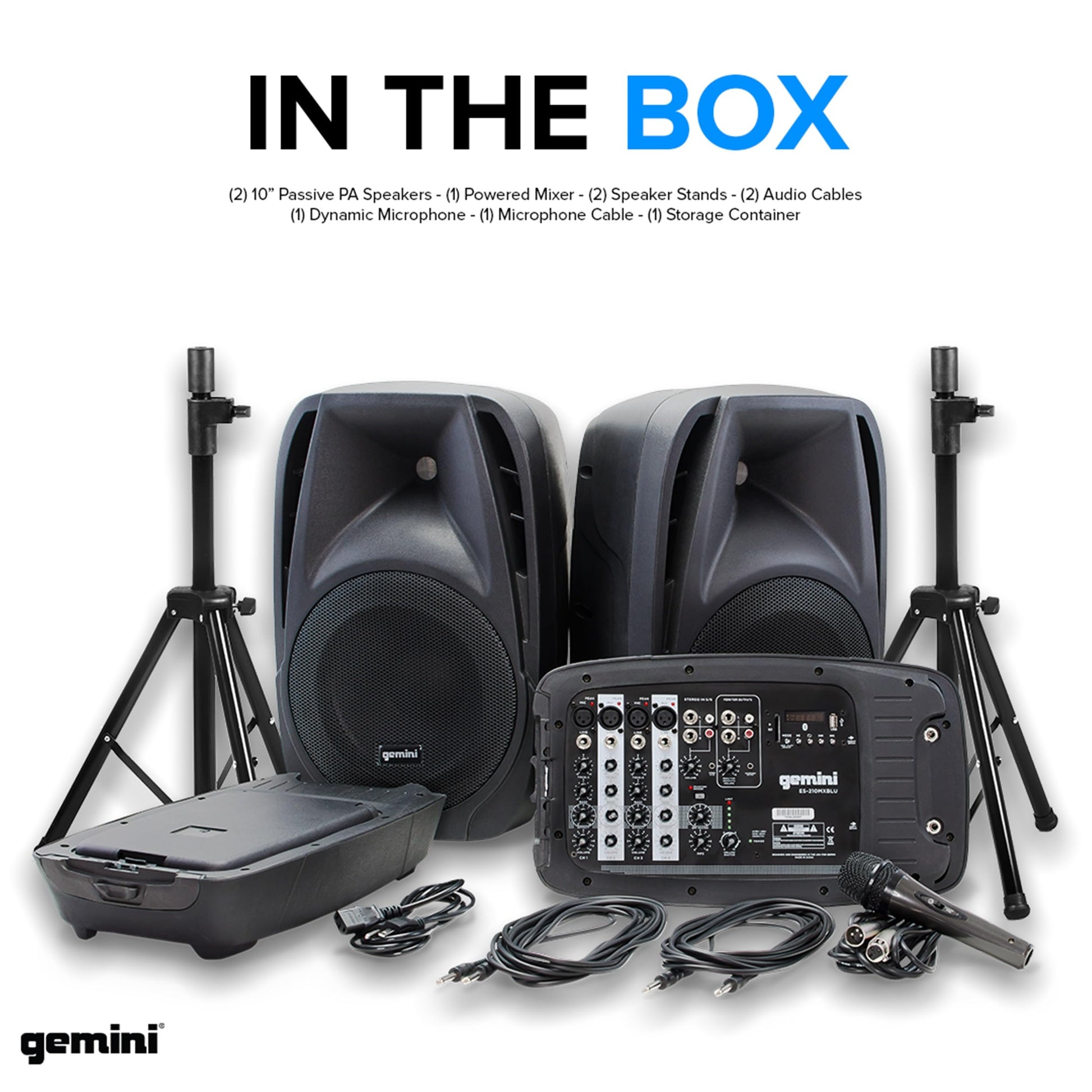 Gemini Portable PA System with Stands, Bluetooth, 600W Powered System with 6-Channel Mixer, Dual 10" Speakers, Mic & Cables—All-in-One for Events, DJs & Fitness (ES-210MXBLU-ST)