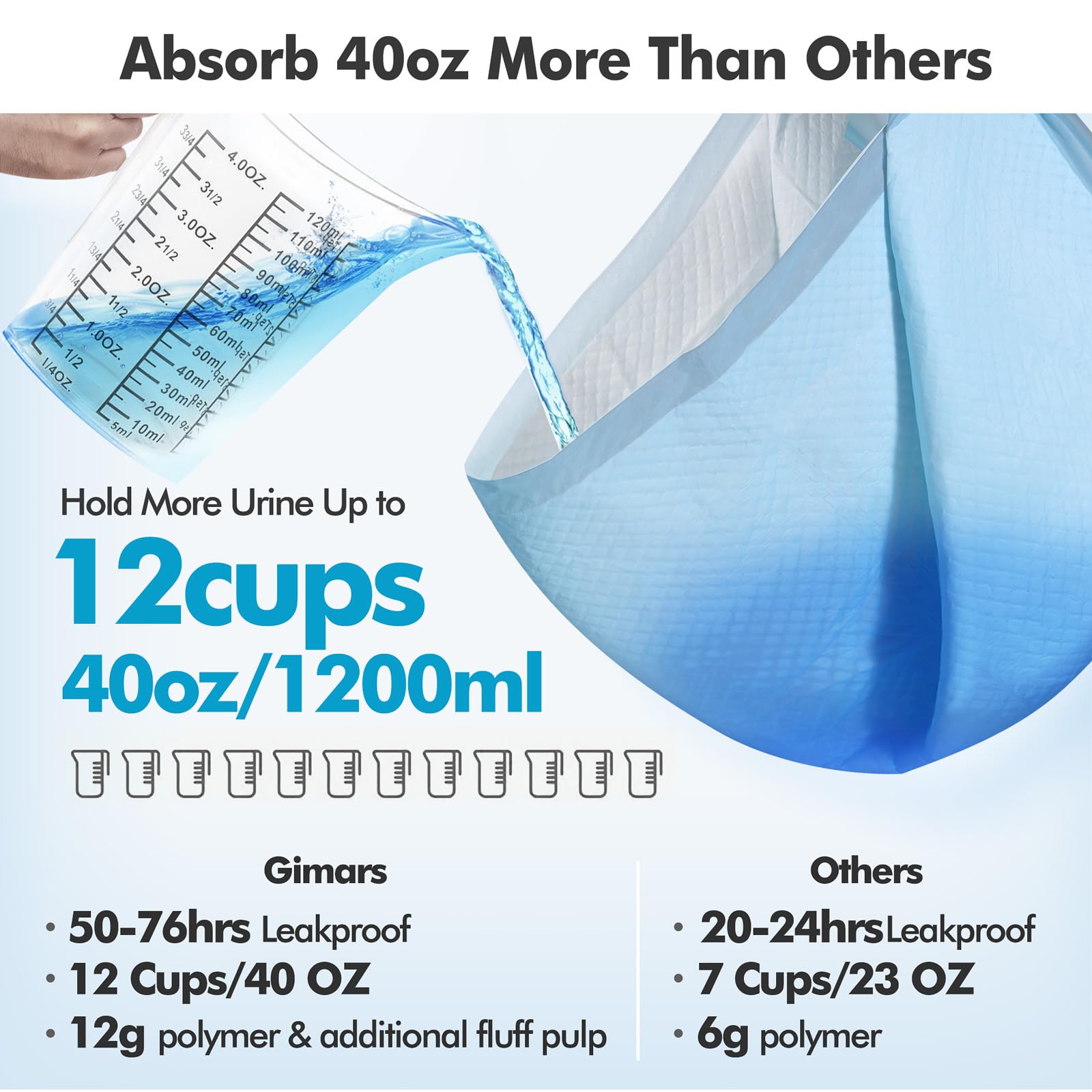 - 【Hold More Urine Up to 12 Cups by Using 12g Super Absorbent Polymer】 Large capacity to absorb urine, feces, and especially diarrhea. Pet messes happen, get Gimars training pads. Increase to 12g polymer and more fluff pulp than others, swiftly turn liquid into gel, and lock in up to 12 cups of liquid. Ensuring dry and protecting floors and carpets from accidents, and stains for a clean, fresh home.