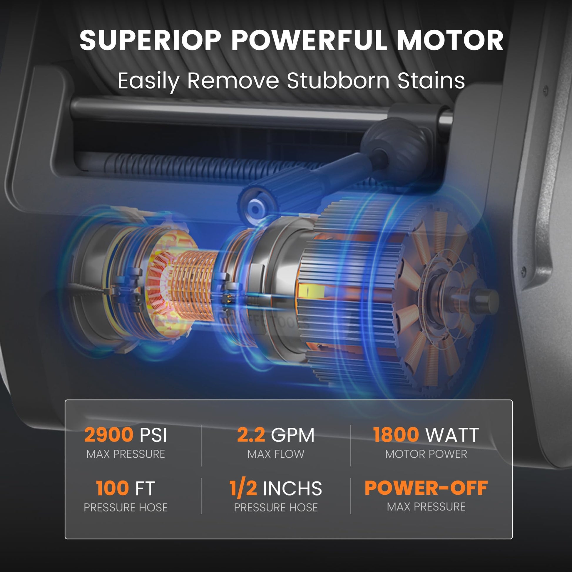 - 1800 Watt Powerful Motor, Quick Cleaning: Generates up to 2900 psi of water pressure and 2.2 gpm of water flow for handling even the most stubborn grime quickly and effortlessly. Tackling tough tasks such as tar, grease, oil stains, rust, and stubborn grime is effortlessly accomplished
