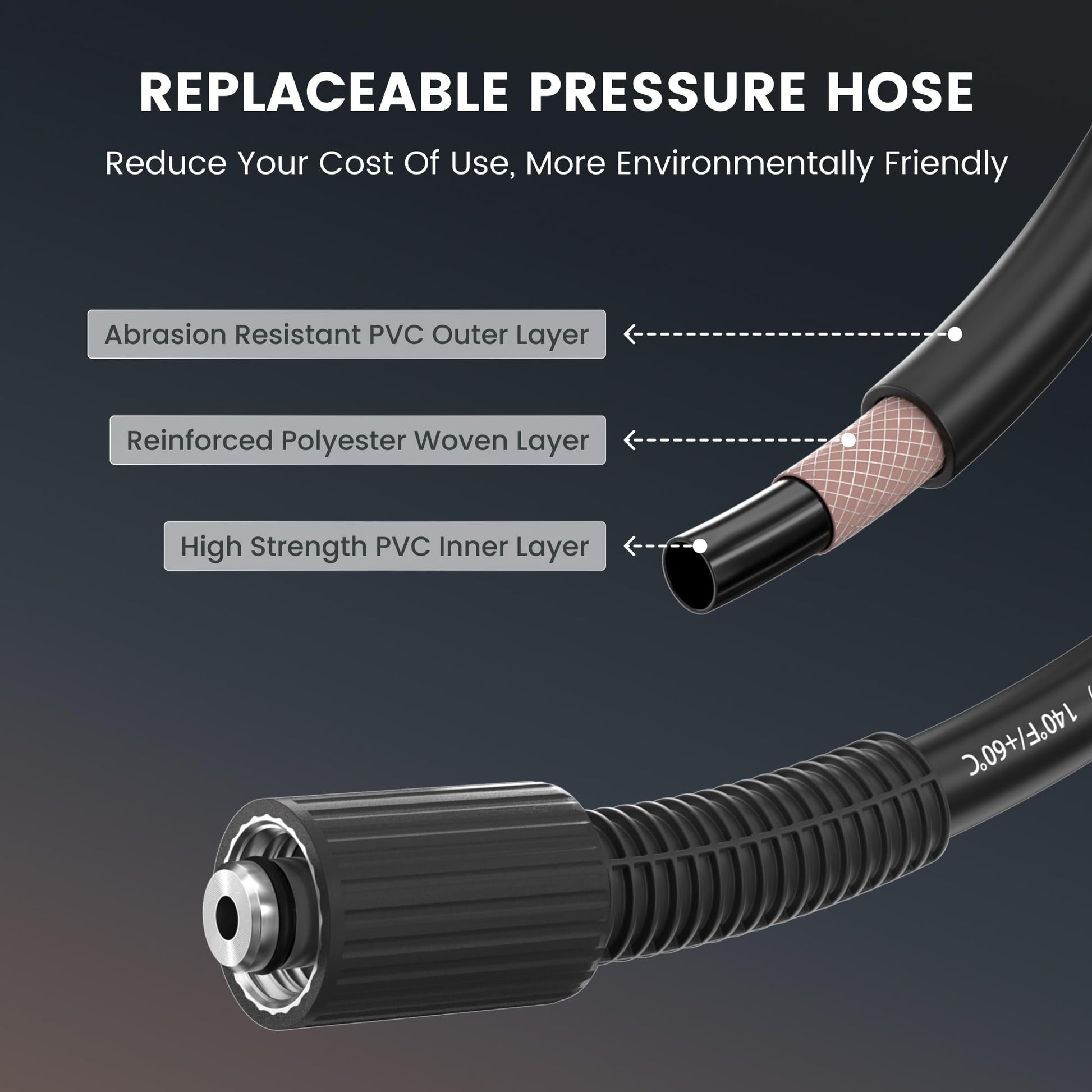 - 100 FT Replaceable Pressure Hose: Giraffe Tools Pressure Washer featuring a 100 ft replaceable hose(32 °F-104 °F). Constructed with three-layer composite anti-explosion material, it's designed to tackle even the toughest cleaning jobs. The detachable hose is for easy recycling and reuse, reducing the amount of product waste