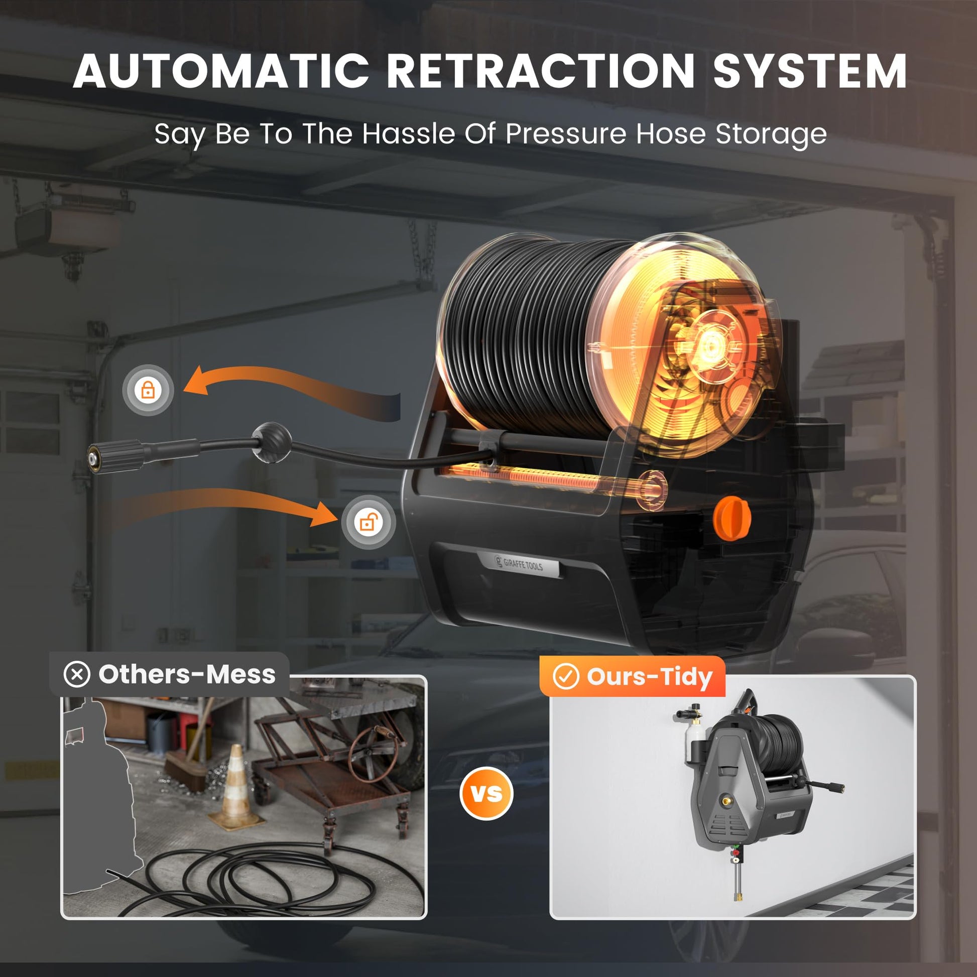 - Any Length Lock: Giraffe Tools power washer is pre-installed with a 100 ft retractable hose, which can lock at any length as you desired