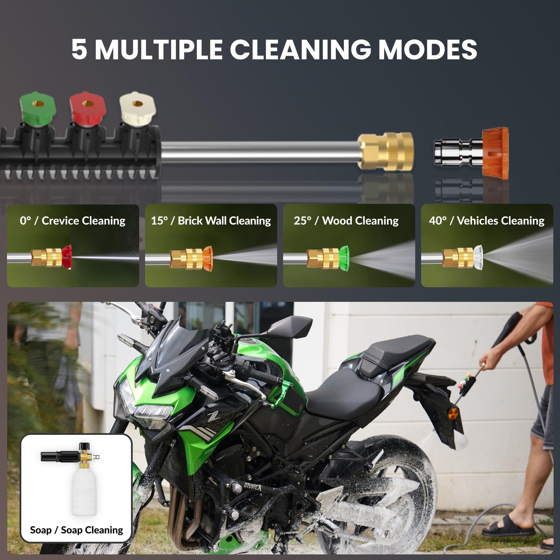 - 4 Quick Connect Nozzles & Foam Cannon: The Giraffe Tools Power Washer comes with 4 quick connect nozzles (0°, 15°, 25°, 40°) for your various needs. Choose the high pressure nozzle that best suits your job. The soap tank allows you to clean your car or veranda with a rich lather, giving you more cleanliness