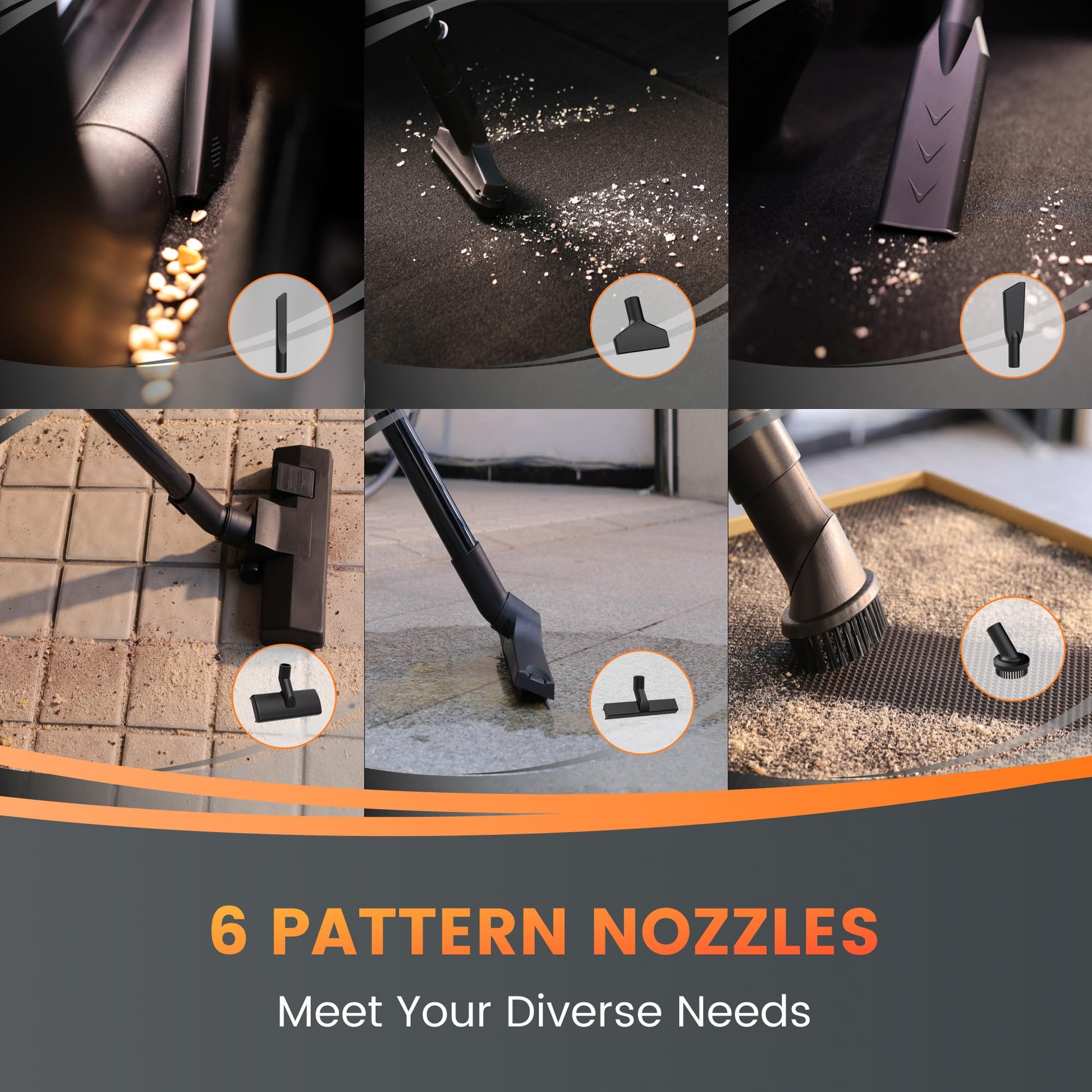 - Wet Dry Vacuum Cleaner Equipped 6 Nozzles: Utilizing a wall-mounted design for both machine and accessories all in space. Comes with 6 attachments to effortlessly master wet and dry cleaning, swiftly eliminating dust, sand, paper debris, hair, food scraps, and liquid spills.