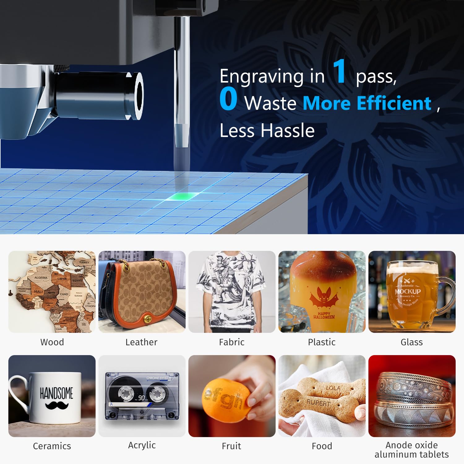 - 【Diode 2.5 X Faster】The laser engraver machine combines laser engraving and laser cutting in one. Cutting wood, acrylic thickness of 8mm. The spot size is only 0.06 x 0.04 mm with a movement precision of 0.01 mm and 400 mm/second. Produces fine works, one-shot engraving success, zero waste.