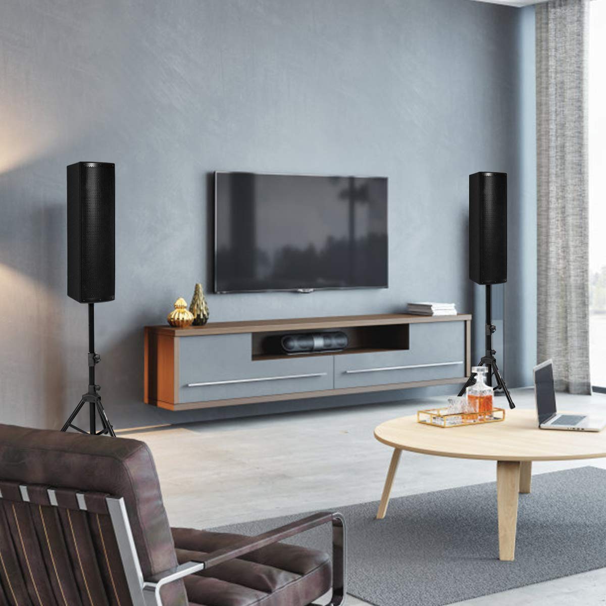 - Easy Mobility and Easy Set-up: Clever enclosure design incorporates rear handle that allows for easy speaker portability. Complete DJ party speaker system set ready to set-up right out of the box. You can either set this speaker at ground or set with stand. There are two tripod stands featuring adjustable height from 4.5ft to 5.5ft to meet your different needs.