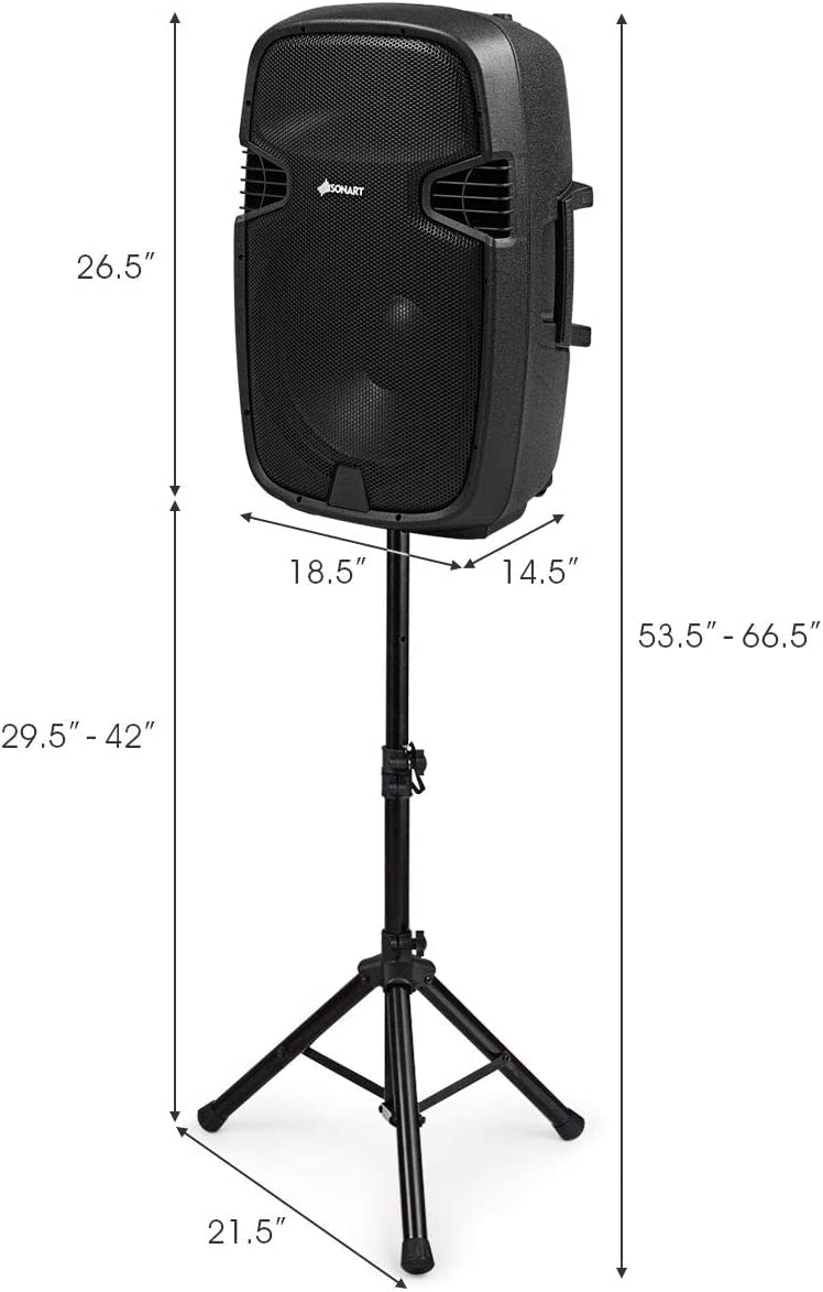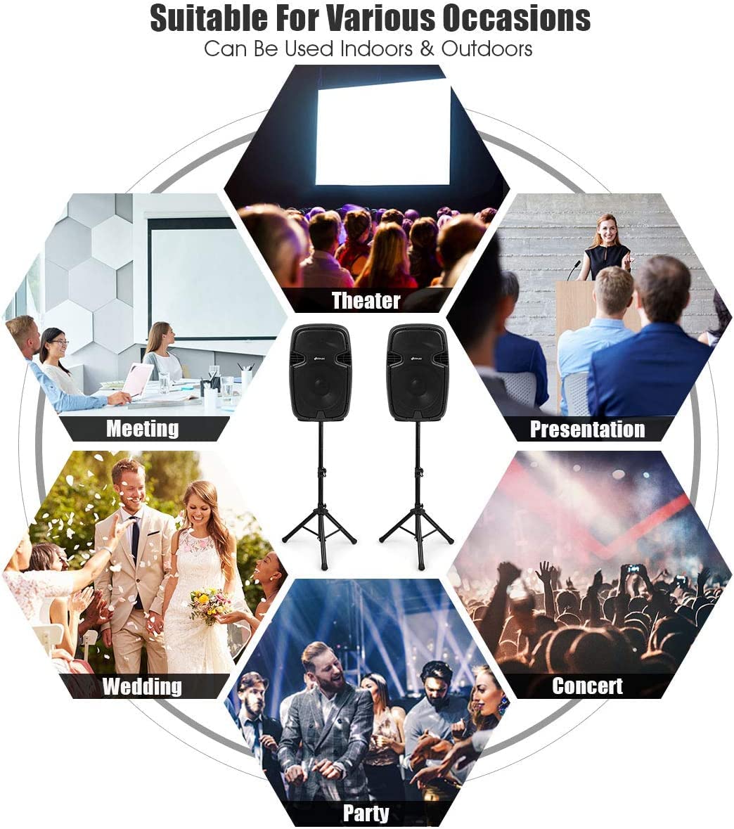 - Easy to Set with Stands: The socket on the bottom of the speaker is exactly suitable to fit the stand and you can fasten it tightly and stably. About the Speaker Stands: Adjustable Height. Steel Construction. Black Color. Weight capacity: 77 lbs.