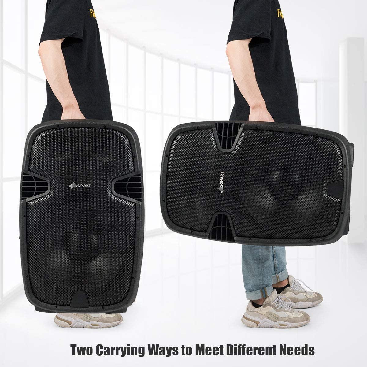 - Portable Design: Take this powered speaker in 3 ways at your convenience with ergonomically shaped handle for easy carrying and setup. You can carry it at the side side/top, or pull it like a trolley case.