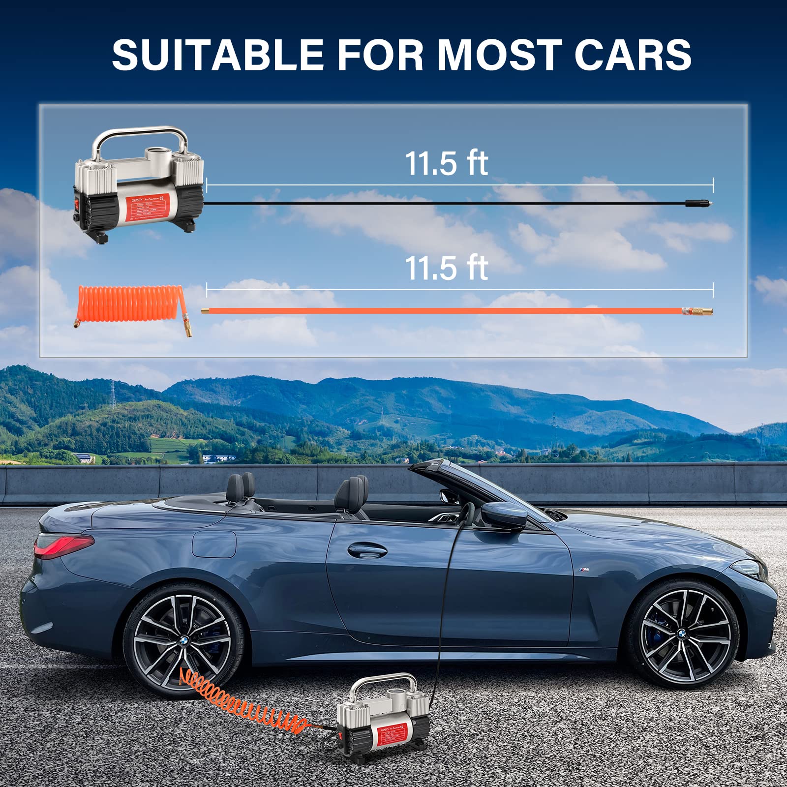 - FAST INFLATION: GSPSCN Heavy Duty Double cylinder design,maximum pressure 150PSI, air flow 70L/min, inflates standard vehicle tire in 1.5 minutes (200/70/R18, 0-40psi).