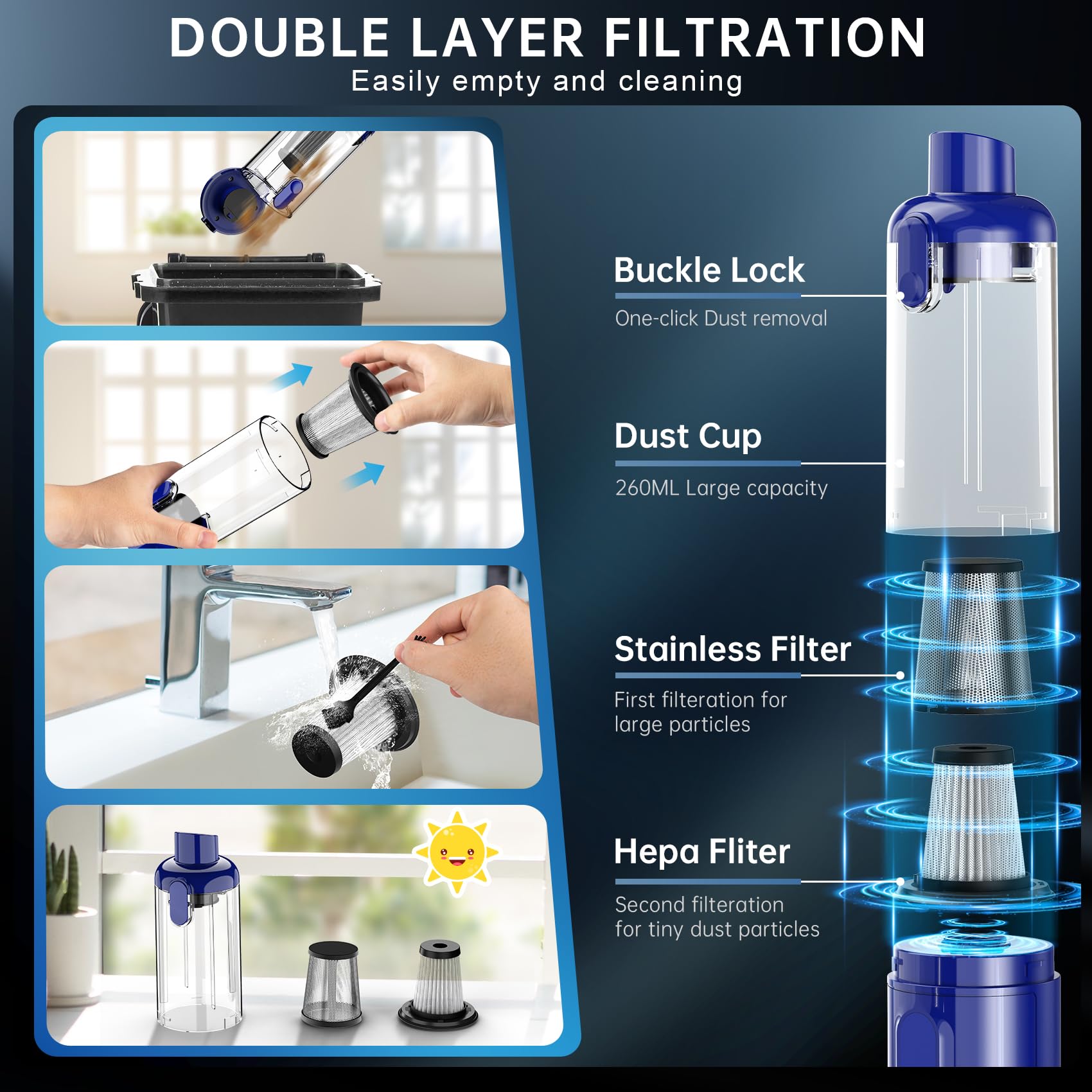 - HIGH POWER SUCTION: Upgraded Brushless Motor supports a maximum speed of 80,000 rpm and provides 16kpa high power suction. 2 modes available easily suck away stubborn sand, dust, and debris in seconds during daily messes. (Hold down the power button for 3S to power on, and hold down the power button again for 3S to power off.)