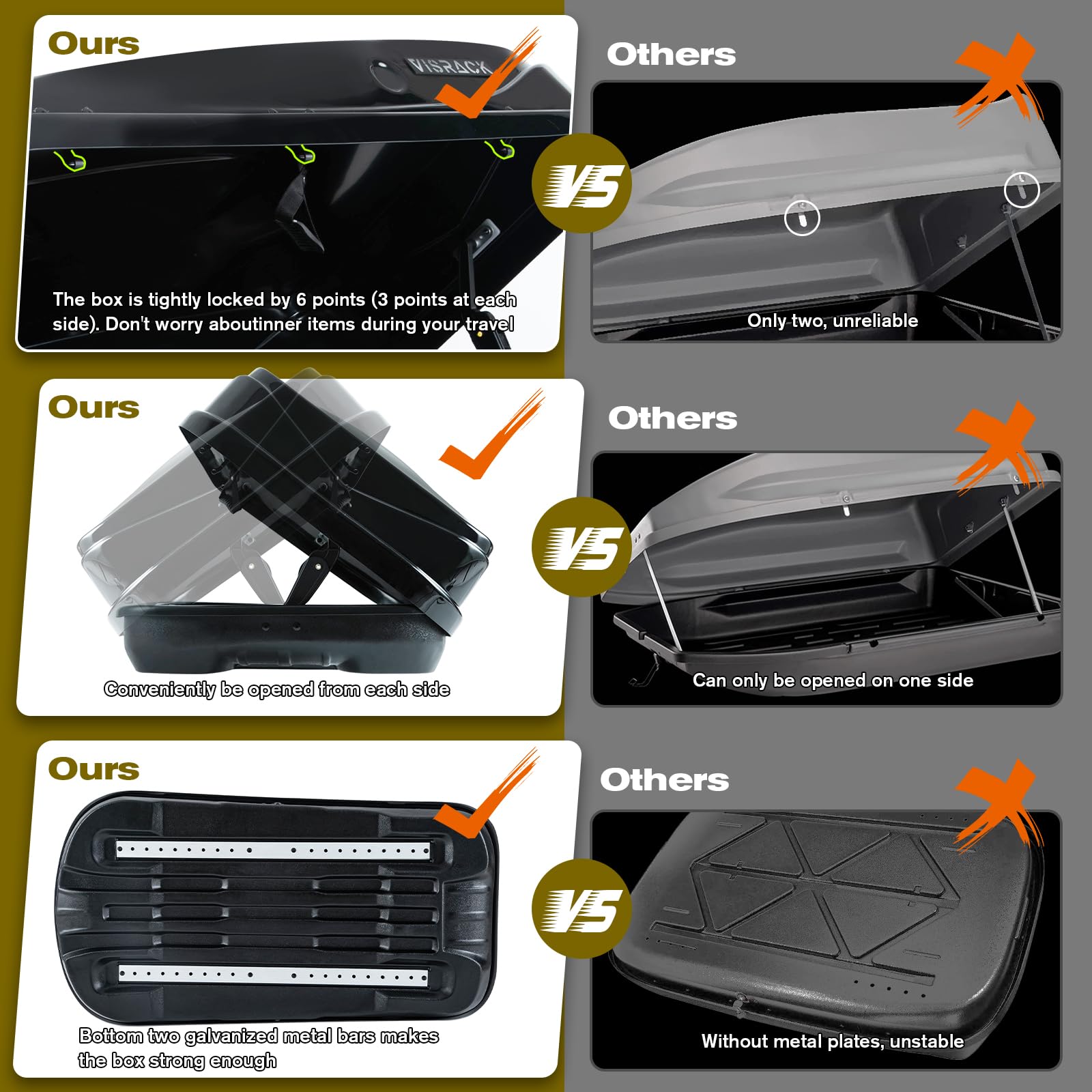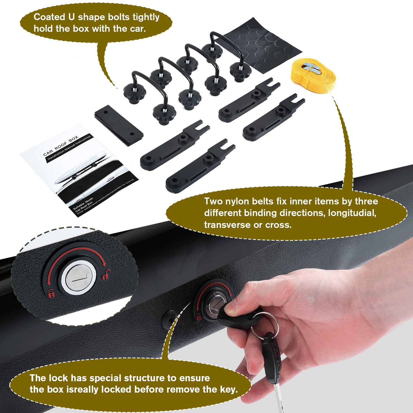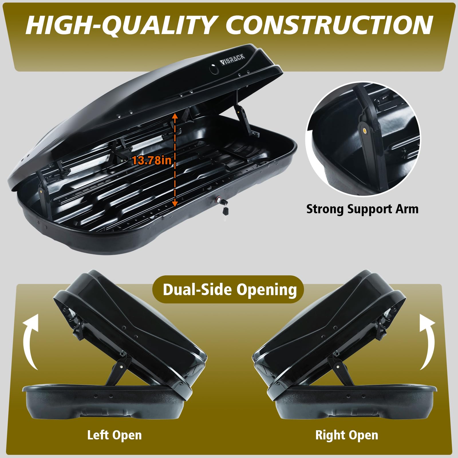 - Durable ABS and PMMA Construction:Made from premium ABS and PMMA materials, this hard shell roof cargo carrier is impact-resistant, weatherproof, and UV-protected, ensuring your belongings stay safe and secure in any condition.