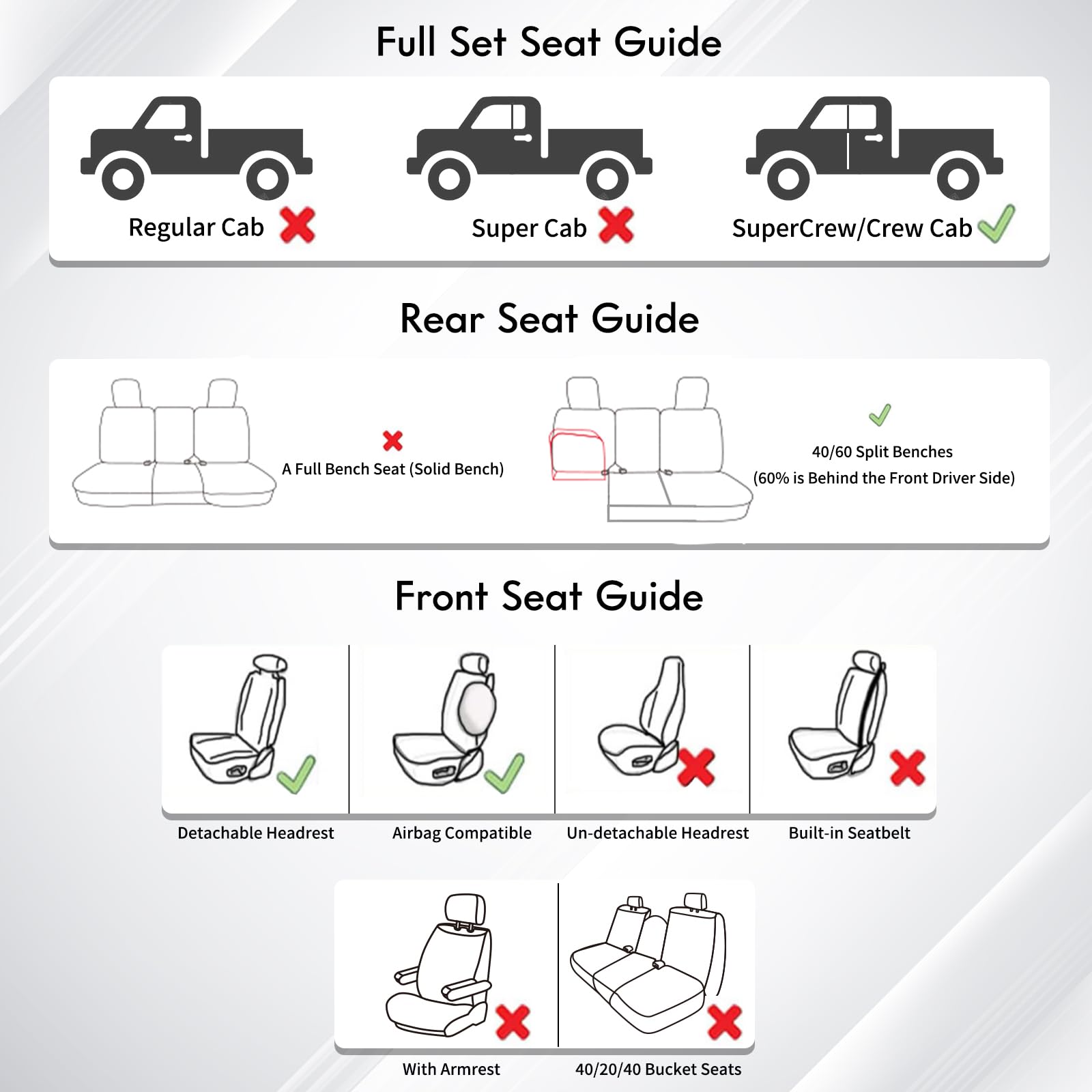 - F150-F450 CUSTOMIZED – The front & rear seat covers compatible with 2015-2025 Ford F150 SuperCrew and 2017-2025 F250 F350 F450 Super Duty (which have the same or similar seat size) Crew Cab XL XLT Lariat King Ranch Platinum, NOT FIT for regular and extended (SuperCab) cab. Full set comes with 2pcs front seat cover, 1pc 60% & 40% backrest cover, 1pc 60%&40% rear bottom cover(60% is behind the driver side), 1pc center console cover, 5pcs headrests
