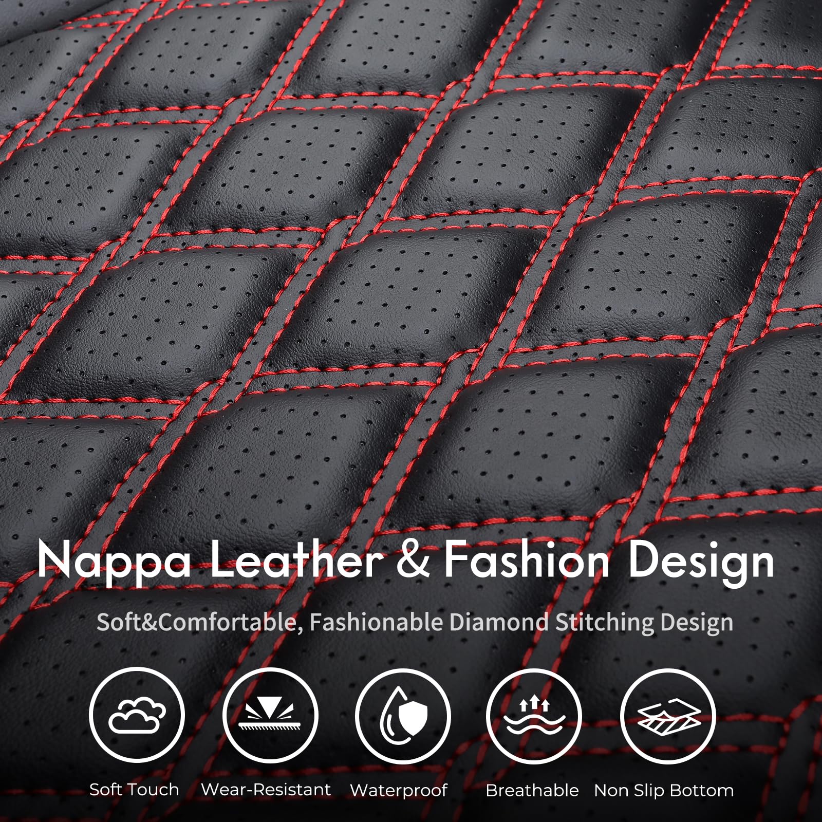 - HIGH QUALITY NAPPA LEATHER – F150 seat covers made of high-quality faux leather, padded with sponge, nonwoven, PP cotton and suede cloth, it's waterproof and wearable, feels softer and more comfortable. It can protect the seat from dirt, dust, pet hairs and being scratched. Easy cleaned by wiping it with a soft wet towel or leather wipes