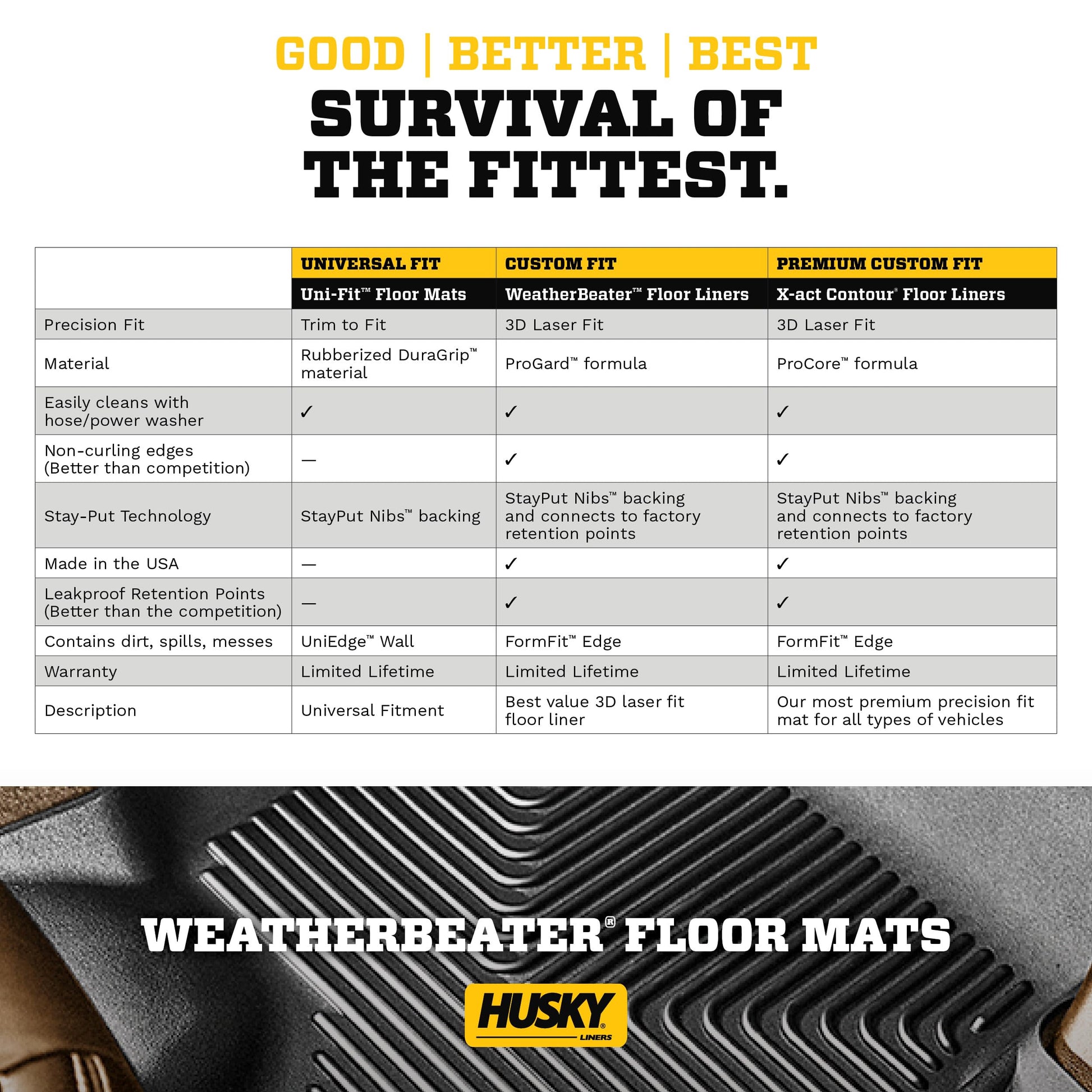 Details: LASER-TIGHT FIT MEETS DURABILITY | The Weatherbeater combines a laser-tight fit with the high durability that built the Husky reputation. The original all-weather liner is ready, come rain, snow or dropped coffee. The Weatherbeater’s construction is a no-slip zone with no edge curl, and its StayPut Nibs keep it firmly anchored underfoot. It stands up to the adventures of everyday life while staying tough and flexible, even under extreme temperatures. Its laser-scanned, FormFit Design gives your truck, van, or SUV an ultra-clean look with easy cleanup to match, while its FormFit Edge keeps spills contained and carpets unstained. It’s unbeatable Husky protection guaranteed for life. Proudly made in the USA.