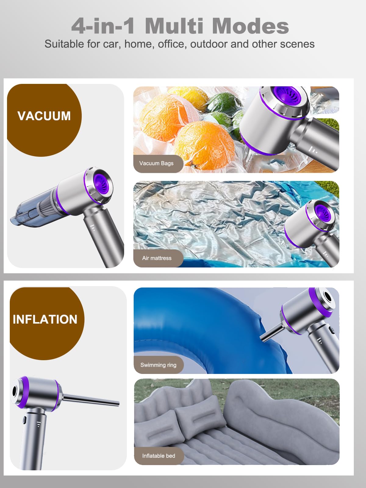 - 【4-in-1 Versatile Car Vacuum】Our cordless handheld vacuum offers vacuuming, blowing, inflating, and suction, making it your all-in-one tool. Use the vacuum and blowing functions to easily clear away small debris. Inflate balloons or camping mattresses with ease using the inflating feature, or use the blower to boost flames during outdoor activities. Quickly remove air from vacuum storage bags with its powerful suction. All of this is possible with one compact device and its versatile attachments