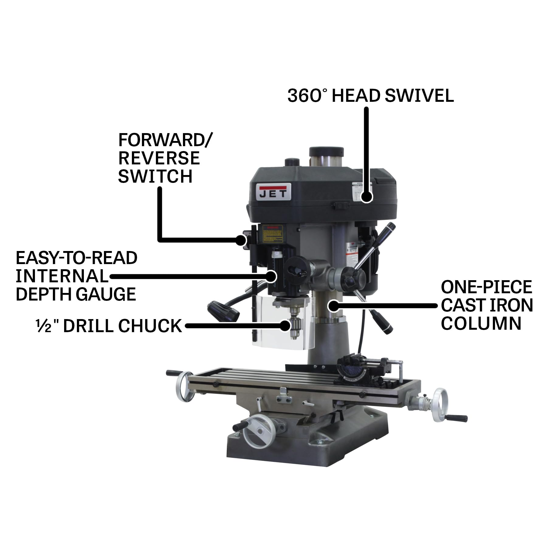 With its generously sized worktable and hinged belt cover for faster speed changing, the Jet JMD-18 Mill Drill Machine is efficient and precise, whether you're working with aluminum, wood, or even ceramic tile. Powered by a UL-listed motor, this high-performance tool has a drilling capacity of 1-1/4 inch and a 15-7/8-inch swing. It also boasts a three-inch face mill capacity, a 3/4-inch end mill capacity, and a host of innovative features, like an easy-to-read internal depth gauge and a worklamp.
