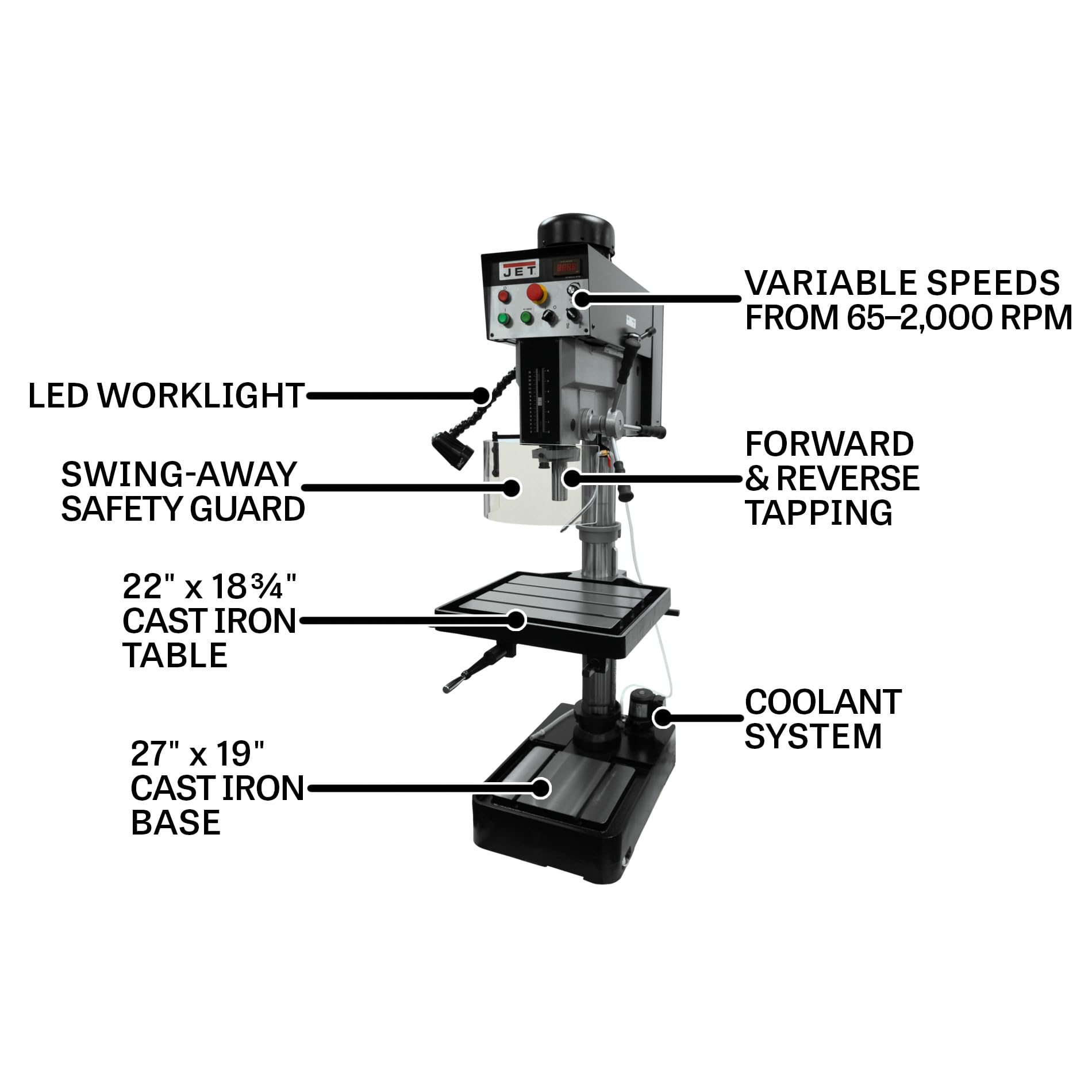 Details: JET Electronic Variable Speed Drill Presses offer spindle speed rates between 65 and 2000 RPM for a wide variety of applications. Designed to permit continuous speed adjustment - even during operation. Tapping capability, an emergency stop and a heavy-duty casted head are but a few of the features JET includes to enhance overall use and accuracy.