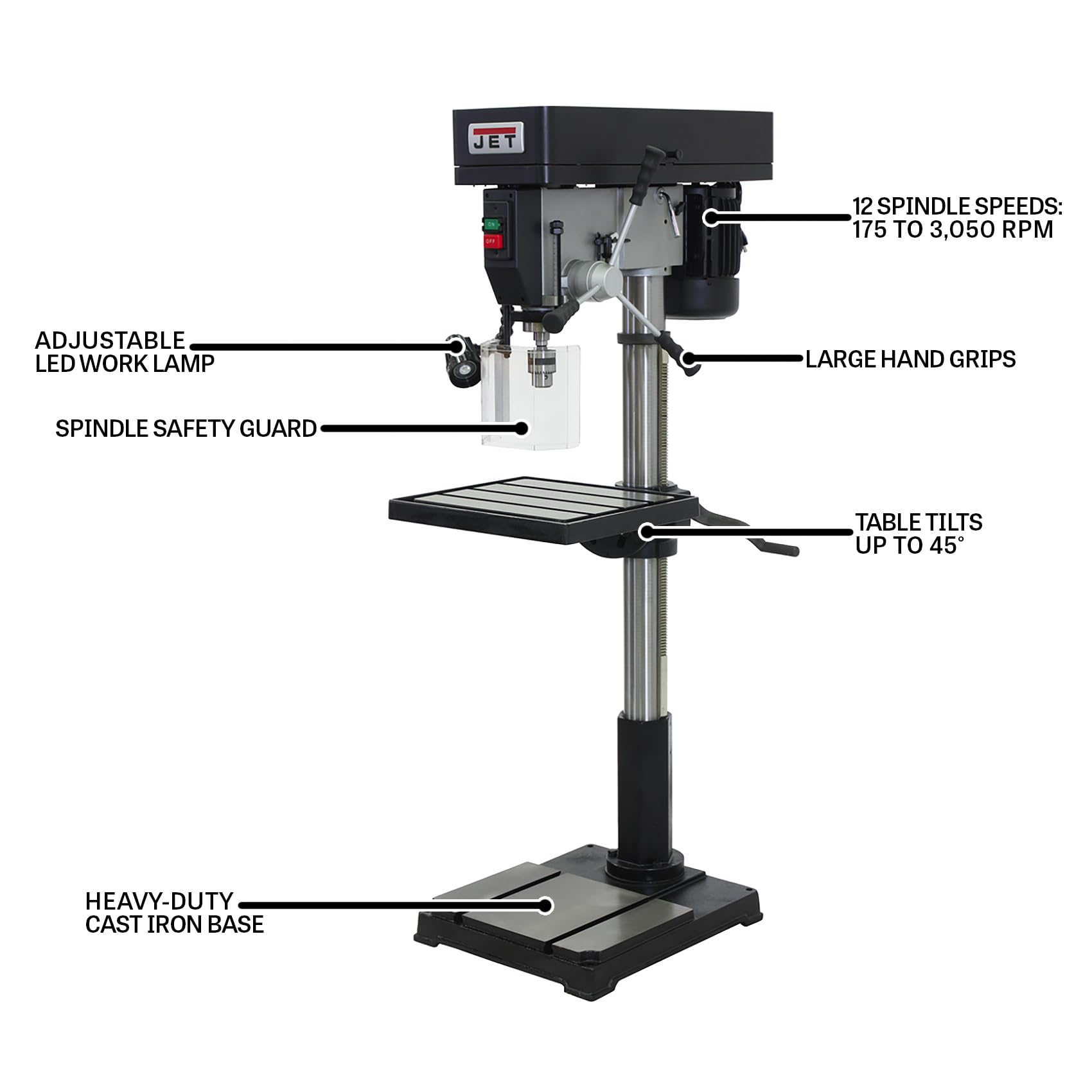 Details: Accuracy, stability, and versatility are the benchmark features of the JET 22' drill presses. This high quality line of JET drill presses offer a greater range in spindle speeds than other machines of this class. JET backs their machines with the industry-leading Two-Year Warranty.