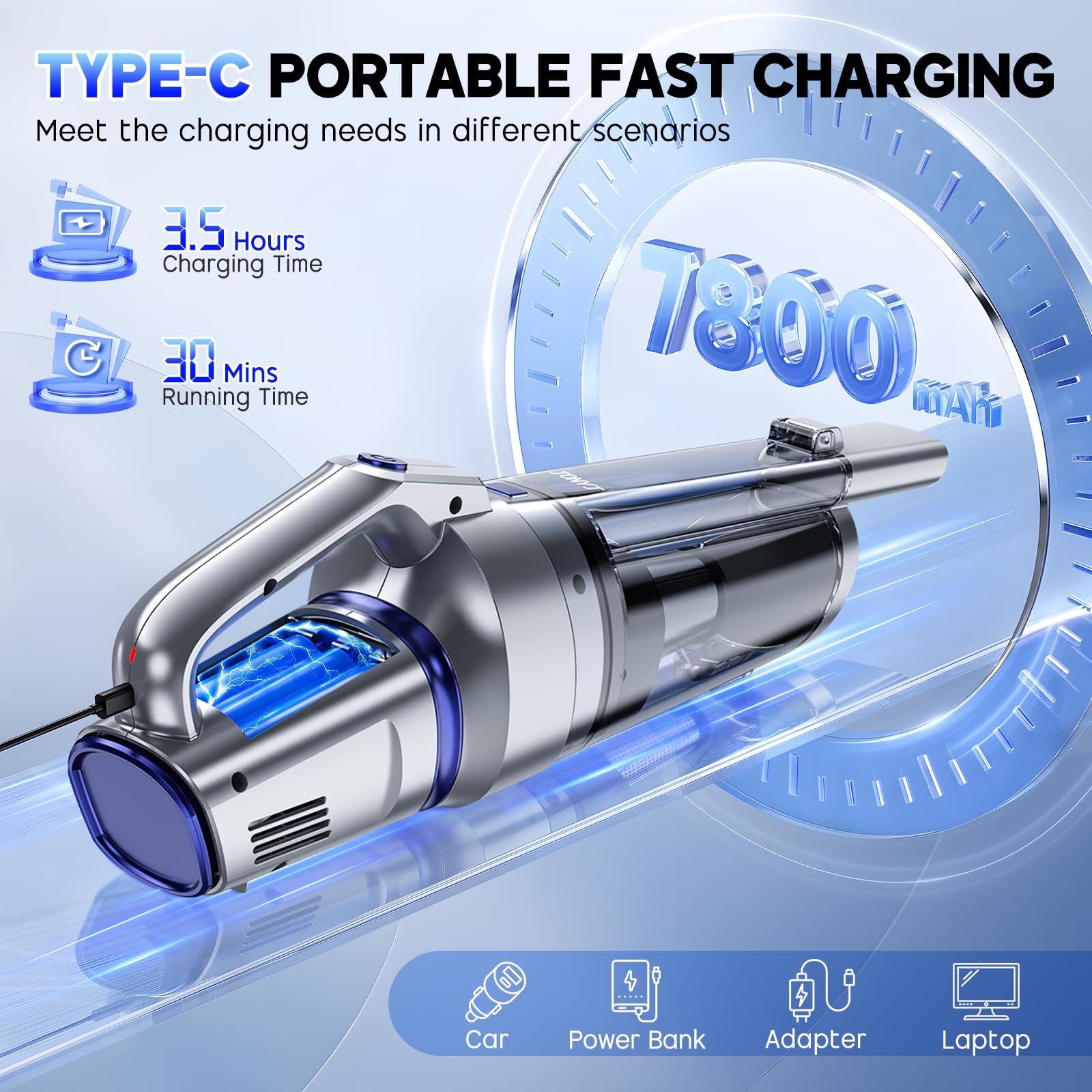 - đăTYPE-C FAST CHARGING & LONG BATTERY LIFEăThis handheld rechargeable vacuum cleaner features a built-in 7800mAh high-capacity battery and adopts Type-C fast charging technology. It can be fully charged in just 3.5 hours and offers up to 30 minutes of runtime, suitable for completing various cleaning tasks. Whether at home, in the office, or in the car, it can be used and charged easily. This hand vacuum is a great helper for daily cleaning